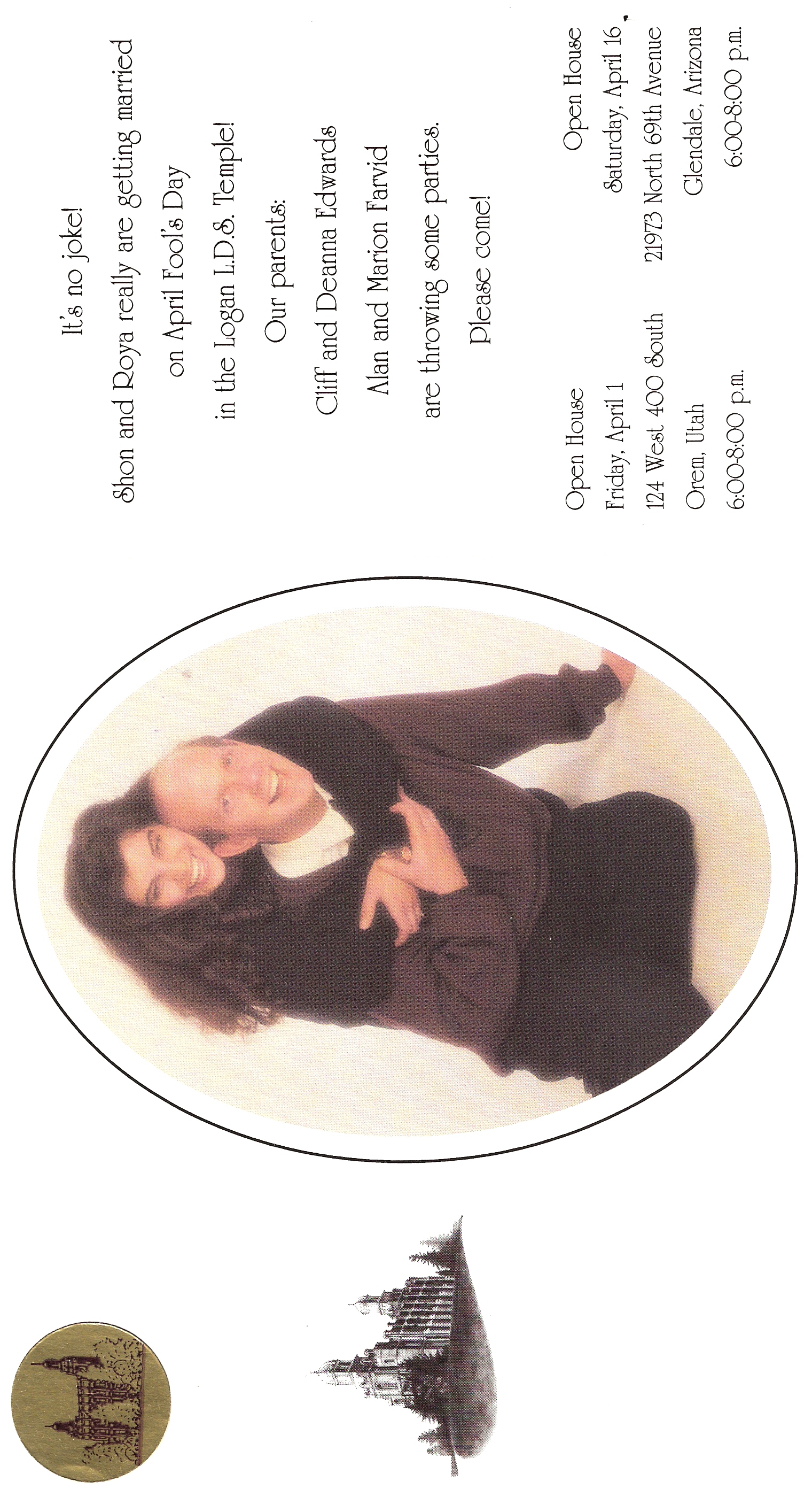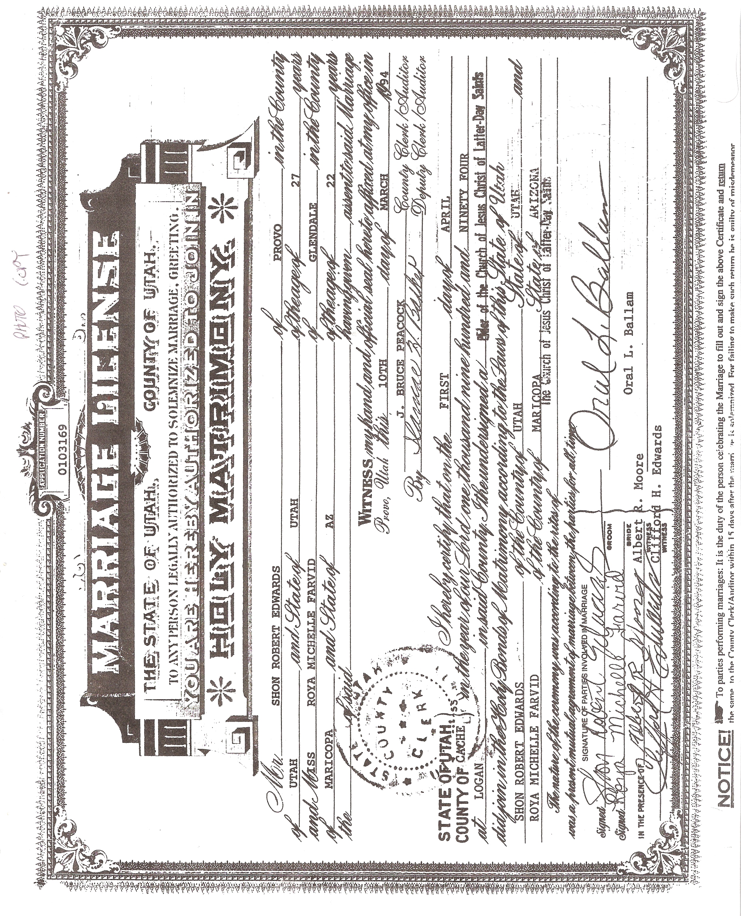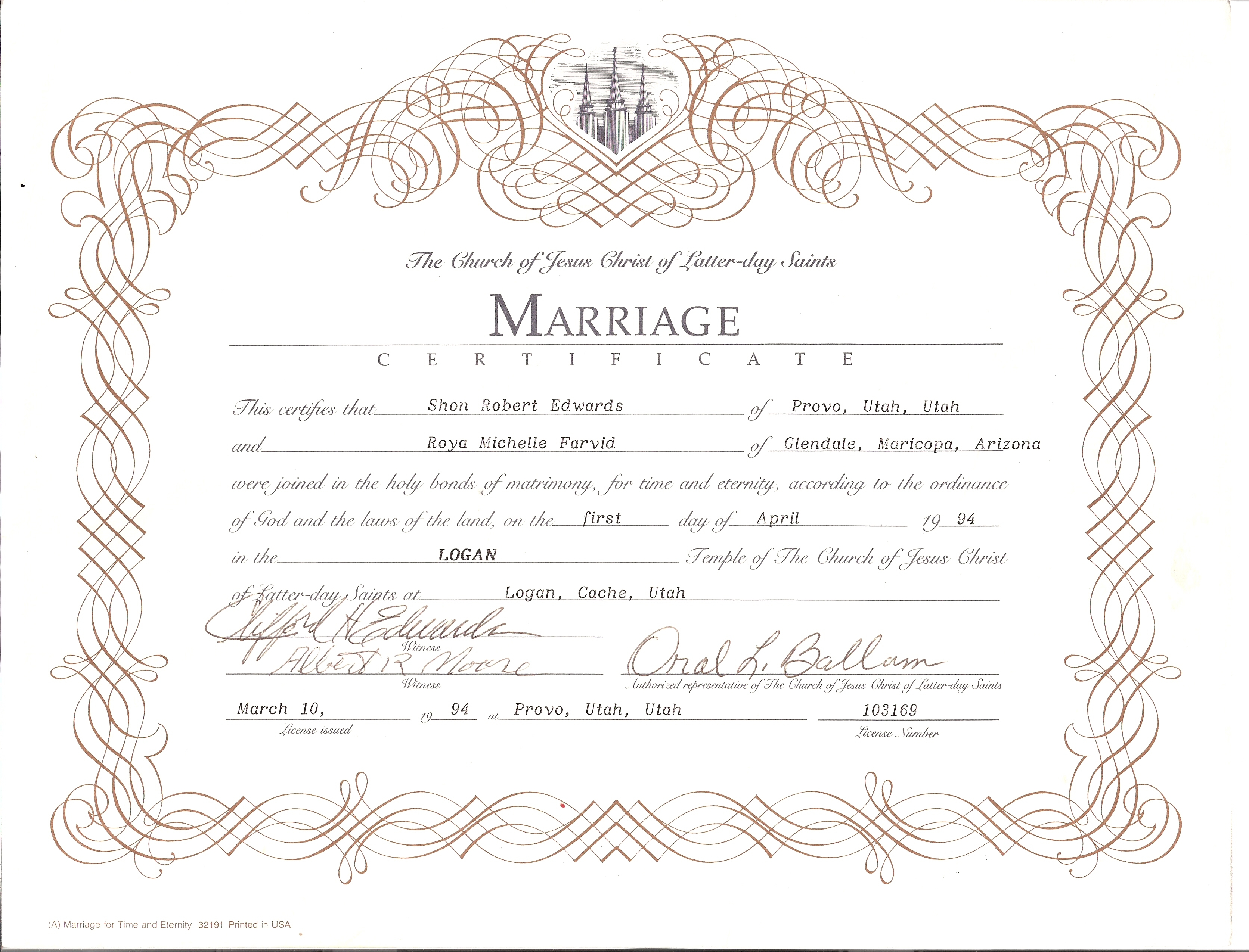 14LDS Records - Marriage Certificate, License no. 103169, 01 Apr 1994. "Chruch of Jesus Christ of Latter-day Saints. Marriage certificate. This certifies that Shon Robert Edwards of Provo, Utah, Utah and Roya Michelle Farvid of Glendale, Maricopa, Arizona were joined in the holy bonds of matrimony, for time and eternity, according to the ordinances of God and the laws of the land, on the first day of April 1994 in the Logan Temple of the Church of Jesus Christ of Latter-day Saints at Logan, Cache, Utah. Witnesses: Clifford H. Edwards, Albert R. Moore. Authorized representative of the Church of Jesus Christ of Latter-day Saints: Oral L. Ballam. License issued: March 10, 1994 at Provo, Utah, Utah. License number: 103169."