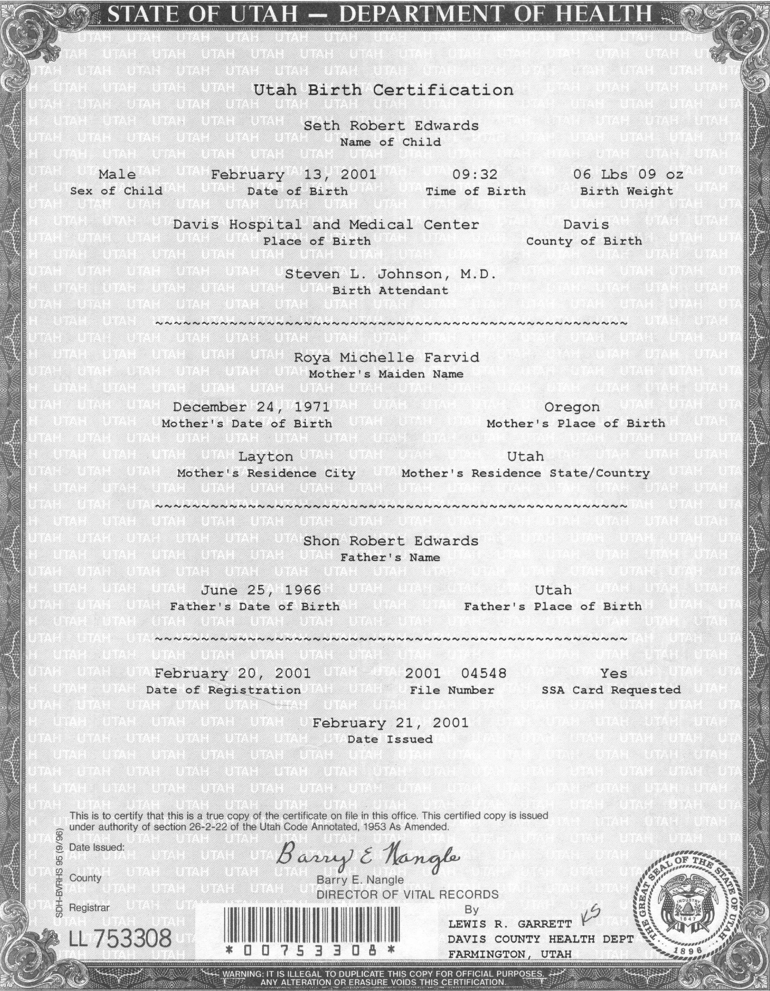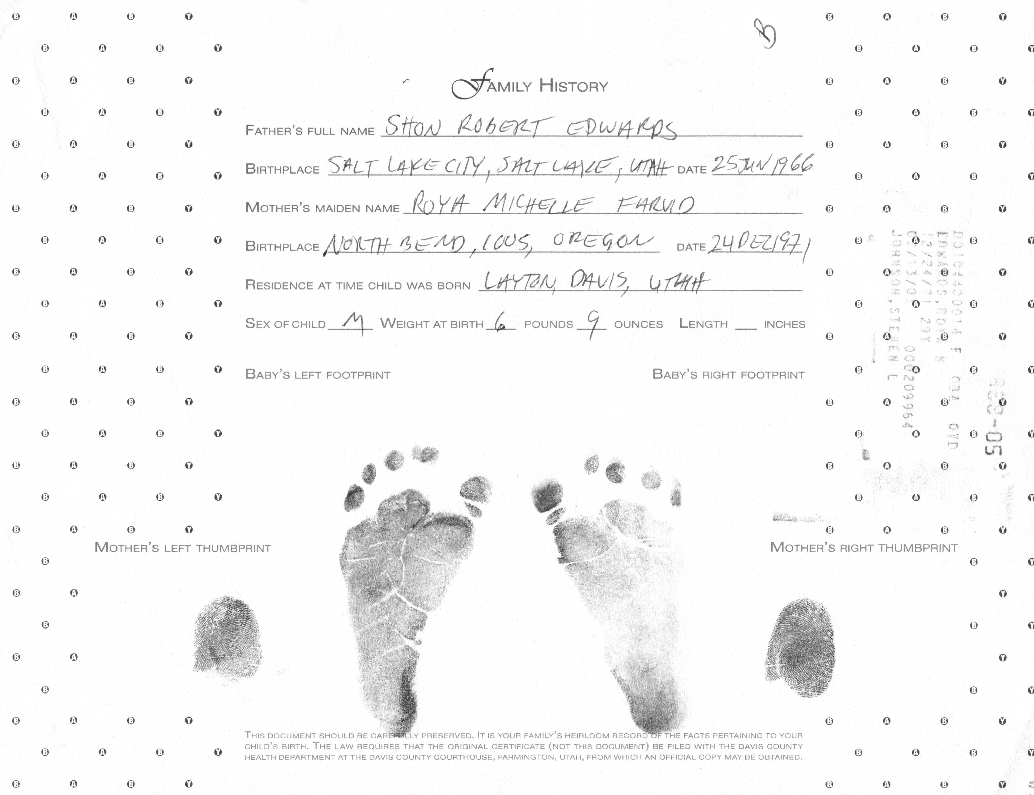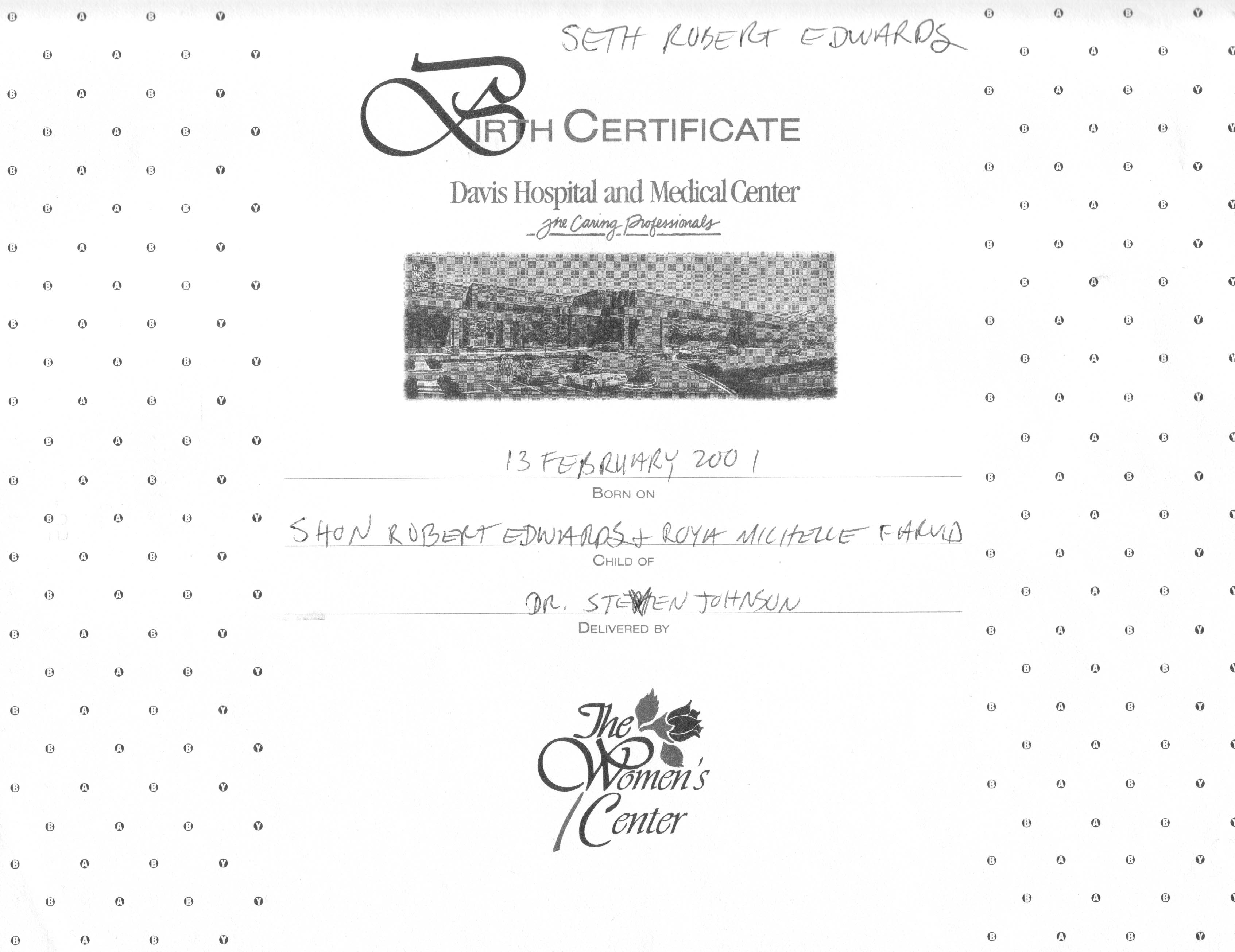 5Davis Hospital and Medical Center, Vital Records - Utah, Davis, Hospital Certificate, p. 1 of 2, 14 Feb 2001, Shon R. Edwards, 1039 N 2575 W, Layton, UT 84041-7709, U.S.A. Made out by father. Image.