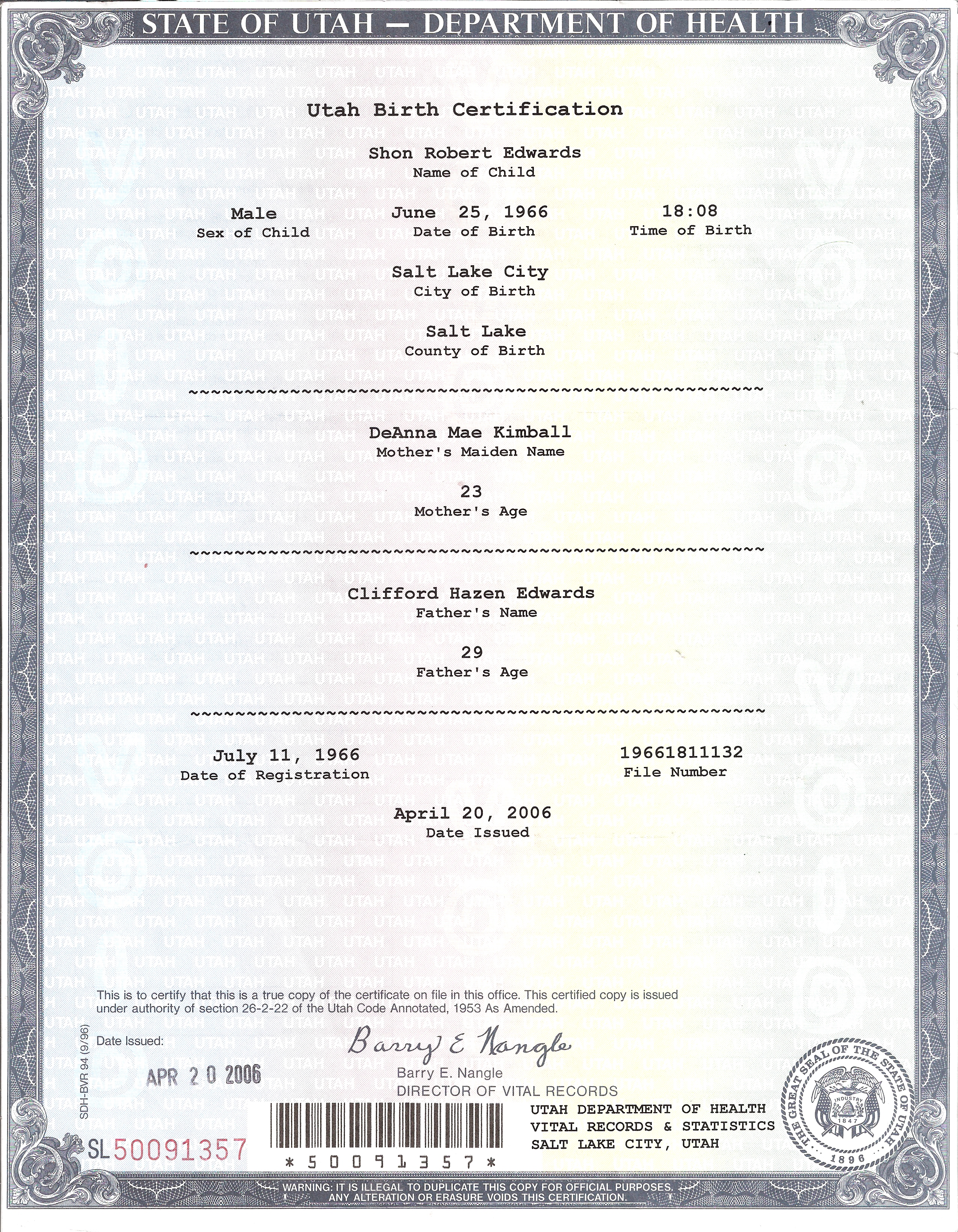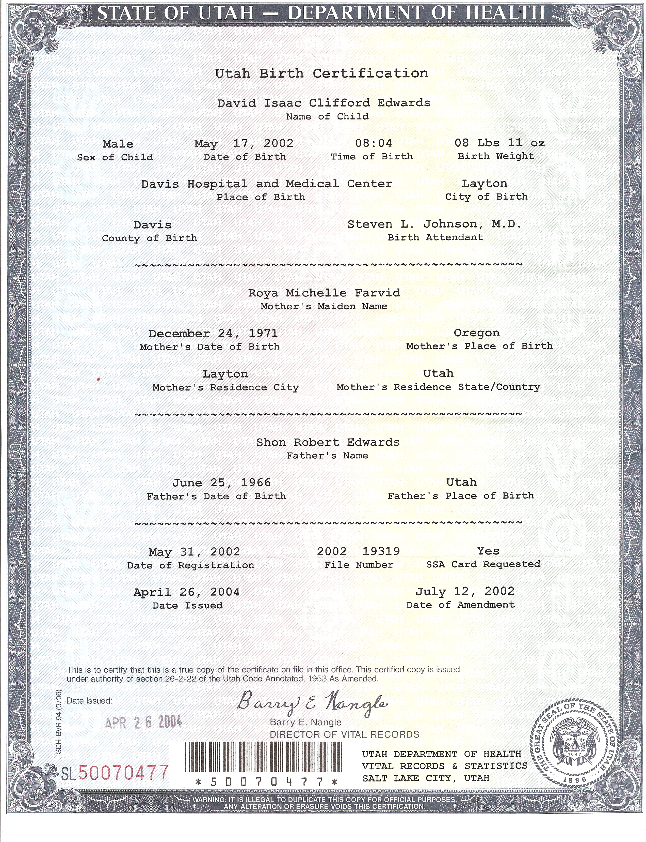 4Birth Certificate for David Isaac Clifford Edwards, Shon R. Edwards, 1039 N 2575 W, Layton, UT 84041-7709, U.S.A. Image.