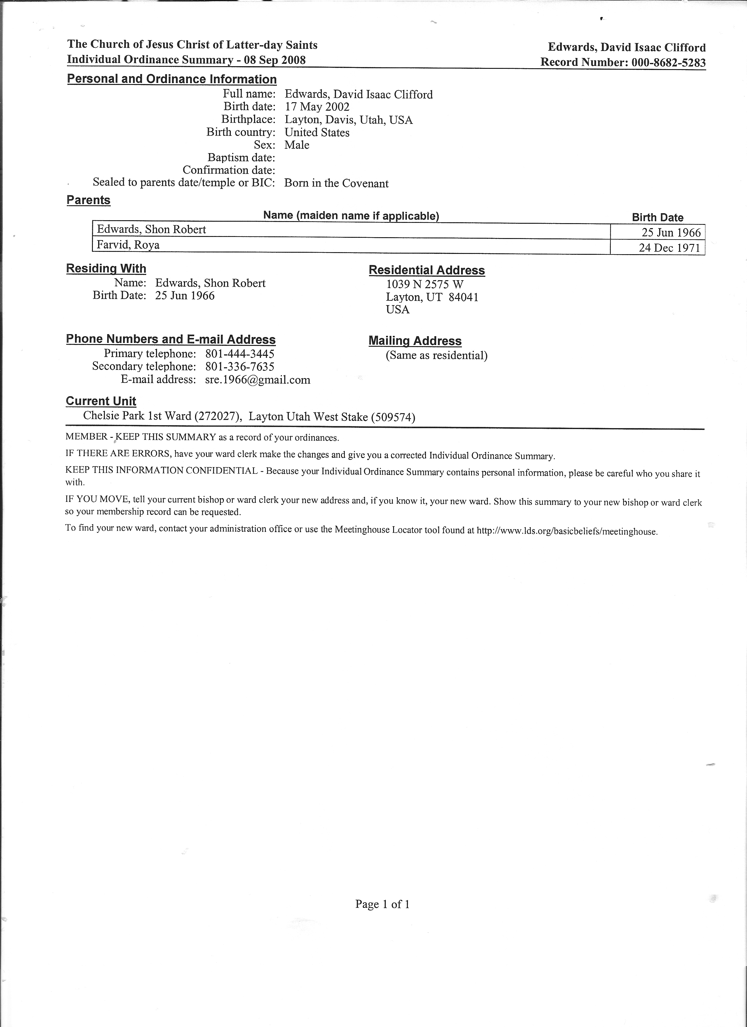 3LDS Church, LDS Church Record - Priesthood Line of Authority, Shon R. Edwards, 1039 N 2575 W, Layton, UT 84041-7709, U.S.A. Image.