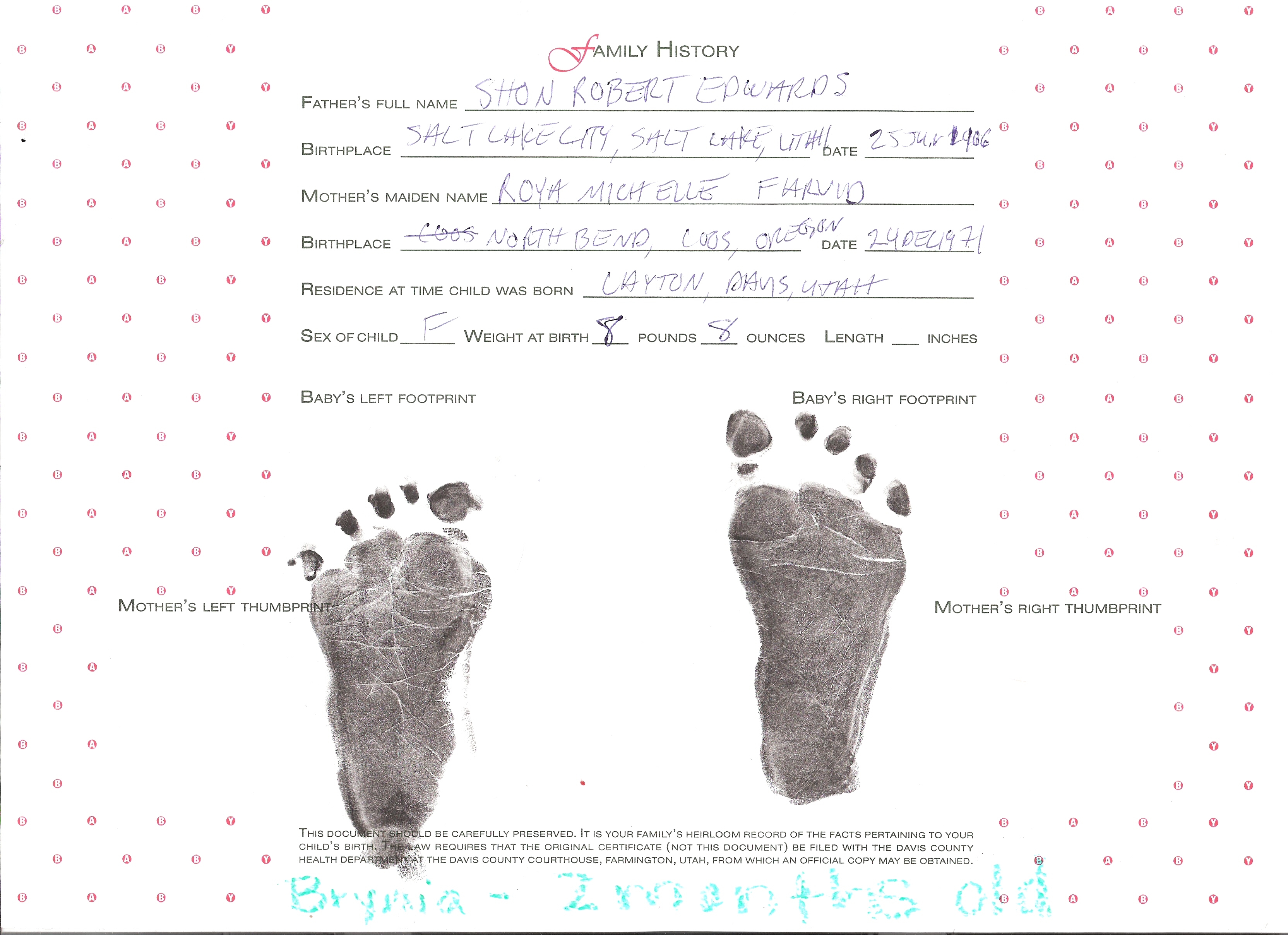 4Hospital birth certificate for Brynia Marie Edwards, p. 2 of 2., Shon R. Edwards, 1039 N 2575 W, Layton, UT 84041-7709, U.S.A. Image.