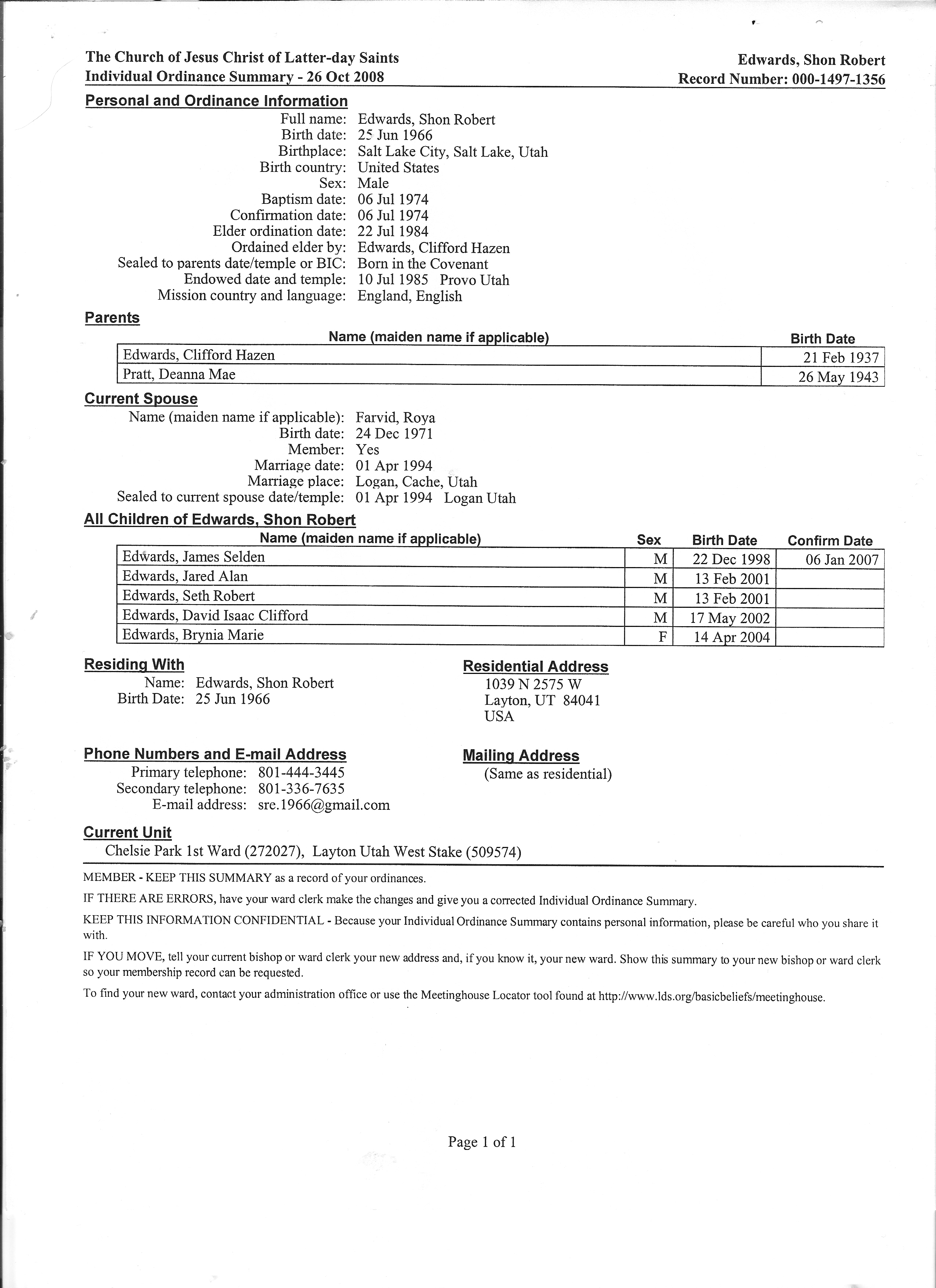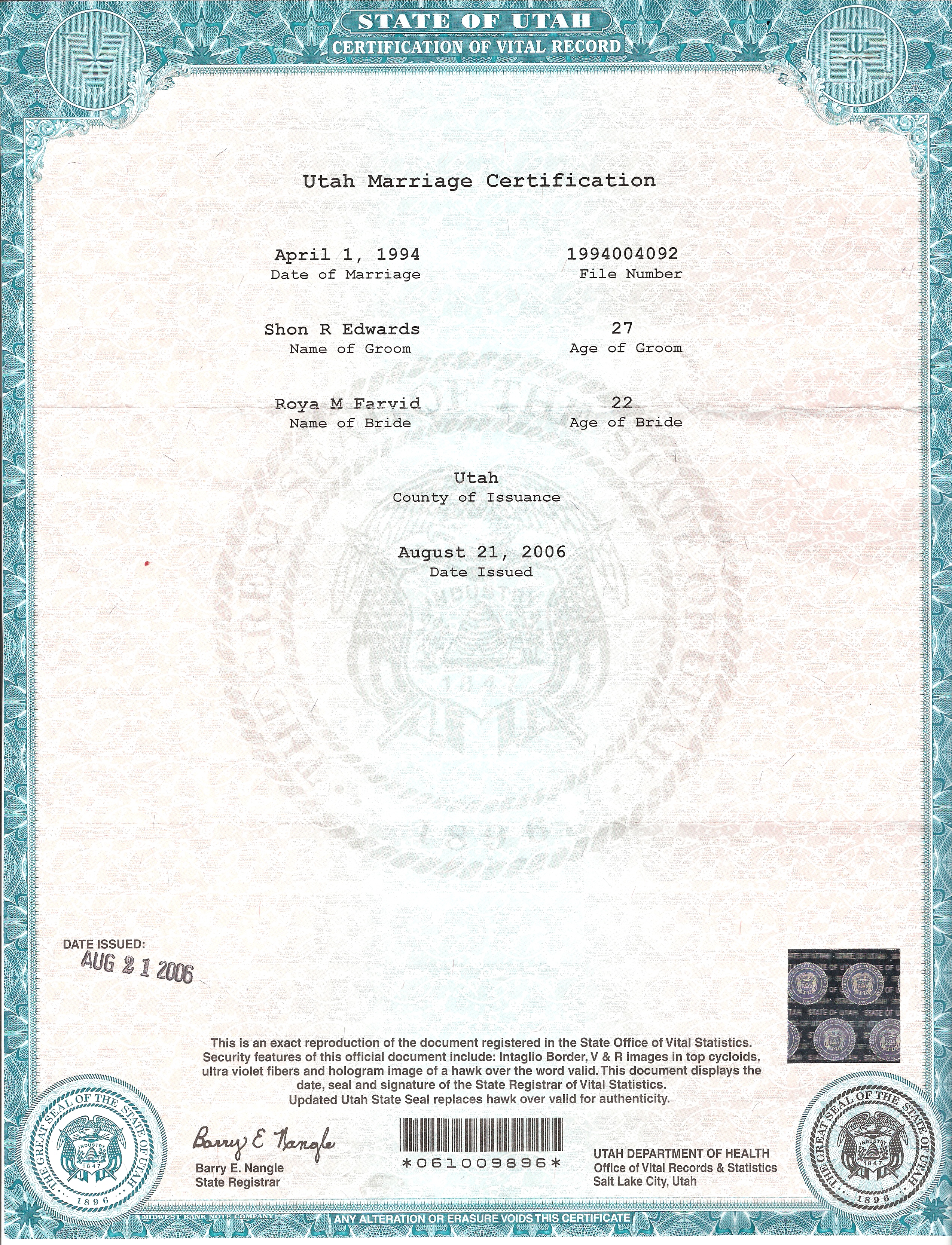 Chruch of Jesus Christ of Latter-day Saints. Marriage certificate. This certifies that Shon Robert Edwards of Provo, Utah, Utah and Roya Michelle Farvid of Glendale, Maricopa, Arizona were joined in the holy bonds of matrimony, for time and eternity, according to the ordinances of God and the laws of the land, on the first day of April 1994 in the Logan Temple of the Church of Jesus Christ of Latter-day Saints at Logan, Cache, Utah. Witnesses: Clifford H. Edwards, Albert R. Moore. Authorized representative of the Church of Jesus Christ of Latter-day Saints: Oral L. Ballam. License issued: March 10, 1994 at Provo, Utah, Utah. License number: 103169." Marriage license. Source Image. Citation Image.16Shon R. Edwards. 1039 N. 2575 W., Layton, UT 84041-7709, U.S.A., sre.1966@gmail.com, (801) 444-3445.