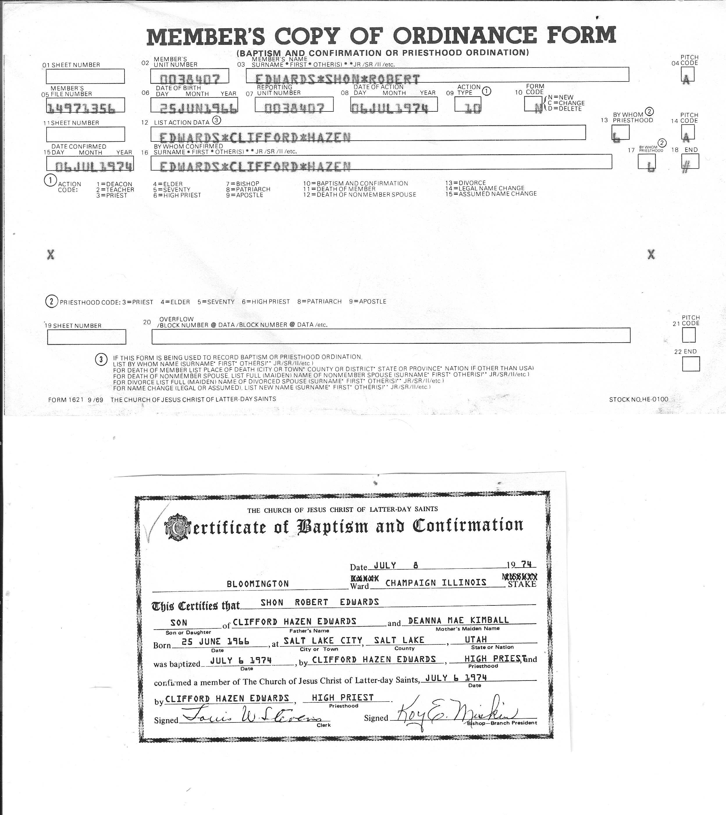 10Church of Jesus Christ of Latter-day Saints, LDS Records - Baptism and Confirmation Certificate, # 000-1497-1356, 08 Jul 1974. "Certificate of baptism and confirmation. Date: July 8, 1974 Bloomington Ward, Champaign Illinois Stake. This certifies that Shon Robert Edwards, son of Clifford hazen Edwards and Deanna Mae Kimball born 25 June 1966 at Salt Lake City, Salt Lake, Utah was baptized July 6, 1974 by Clifford Hazen Edwards, High Priest and confirmed a member of The Church of Jesus Christ of Latter-day Saints July 6, 1974 by Clifford Hazen Edwards, High Priest. Signed Louis W. Stevens, Clerk. Koy E. Miskin, Bishop." Image.