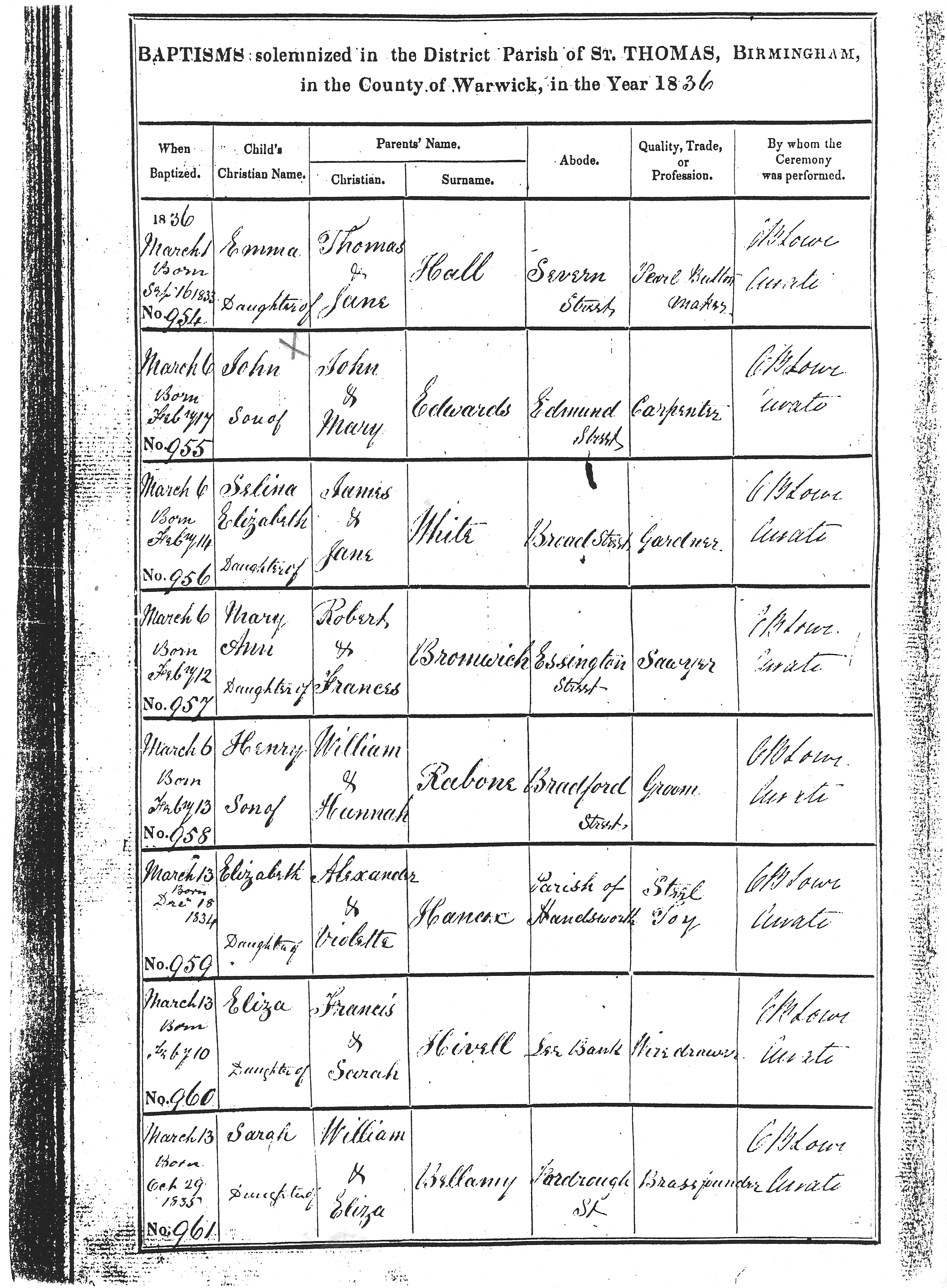 3Church of England, Christening record of John Edwards Jr. (1836), Shon R. Edwards, 1039 N 2575 W, Layton, UT 84041-7709, U.S.A. "Baptisms solemnized in the District Parish of St. Thomas, Birmingham, in the County of Warwick, in the Year 1836.