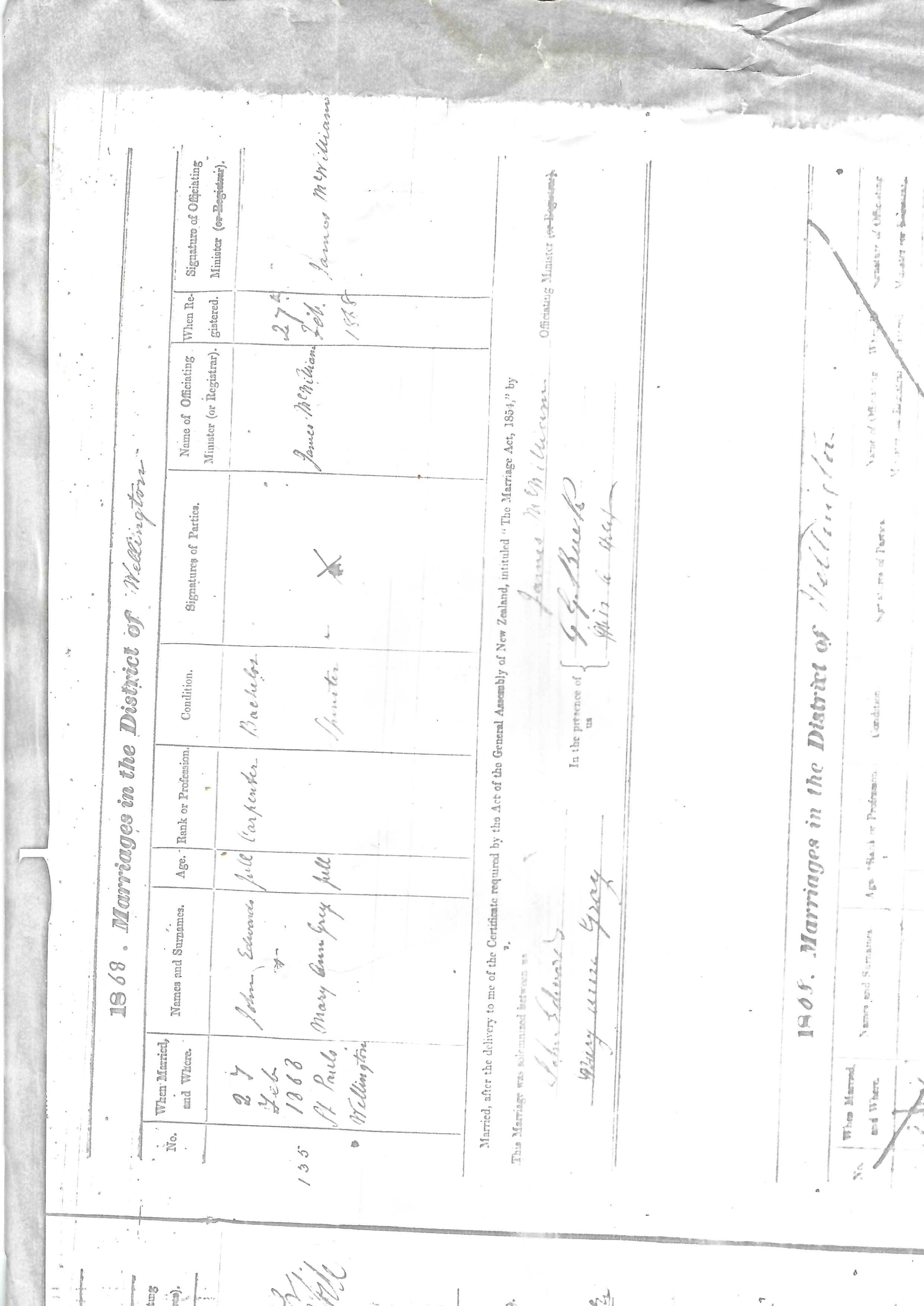 6Vital Records - New Zealand - Civil Registry, Certificate # 2260, 27 Mar 1961, Levin House. "Witnesses were G. G. Buck and Miss A. Gray (her sister, Alice Gray). She was a spinster. James McWilliam was officiating minister."