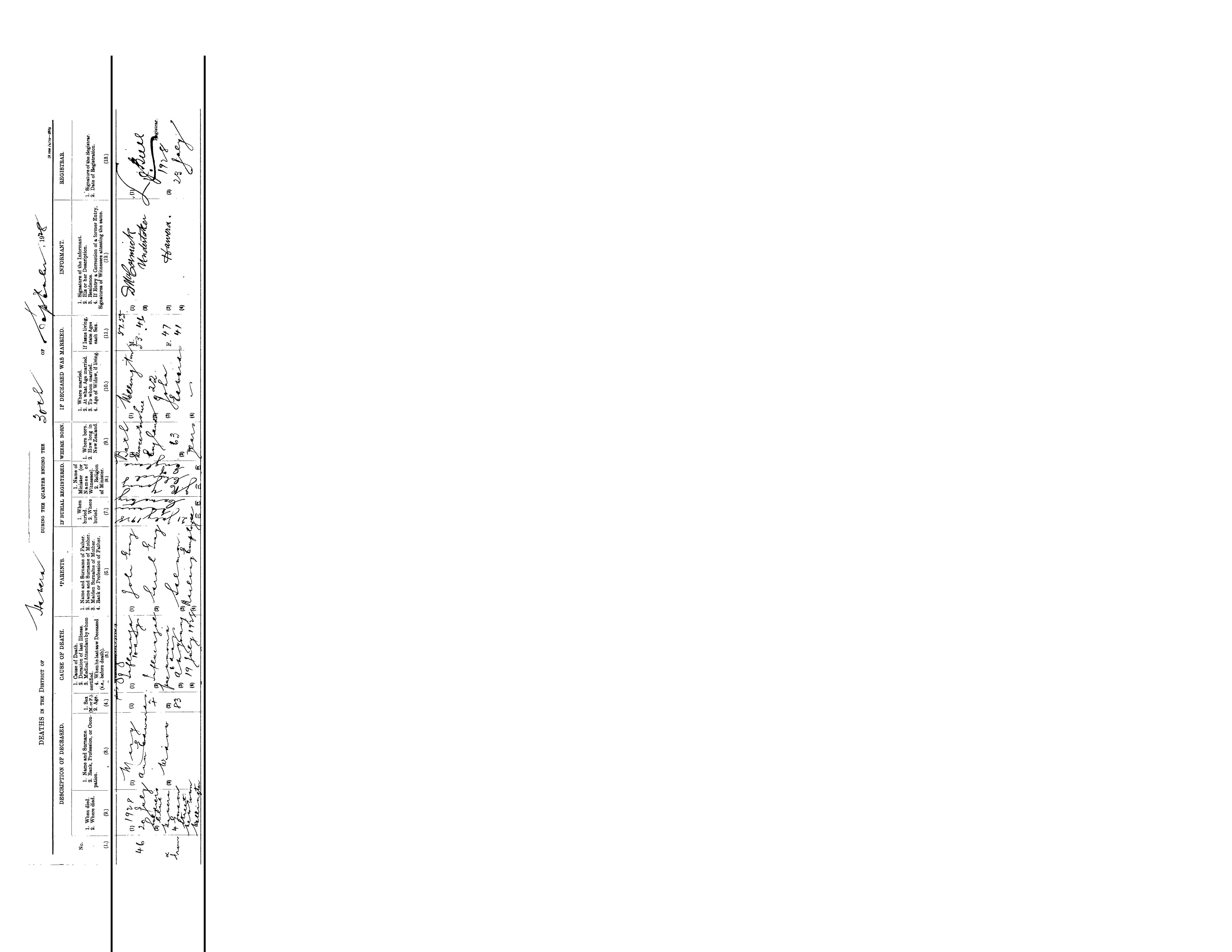 1Vital Records - New Zealand - Civil Registry, Certificate # 11704, 27 Mar 1961, Levin House. "Died at the Soldier's Club, Hawera, from 4 Gordon Street, Newtown, Wellington of influenza, 10 days and influenzal pneumonia, 6 days. Medical attendant by whom certified was A. M. Young and last saw the deceased 19 Jul 1928." Death cert says sg had a dau 46 years old. Image.