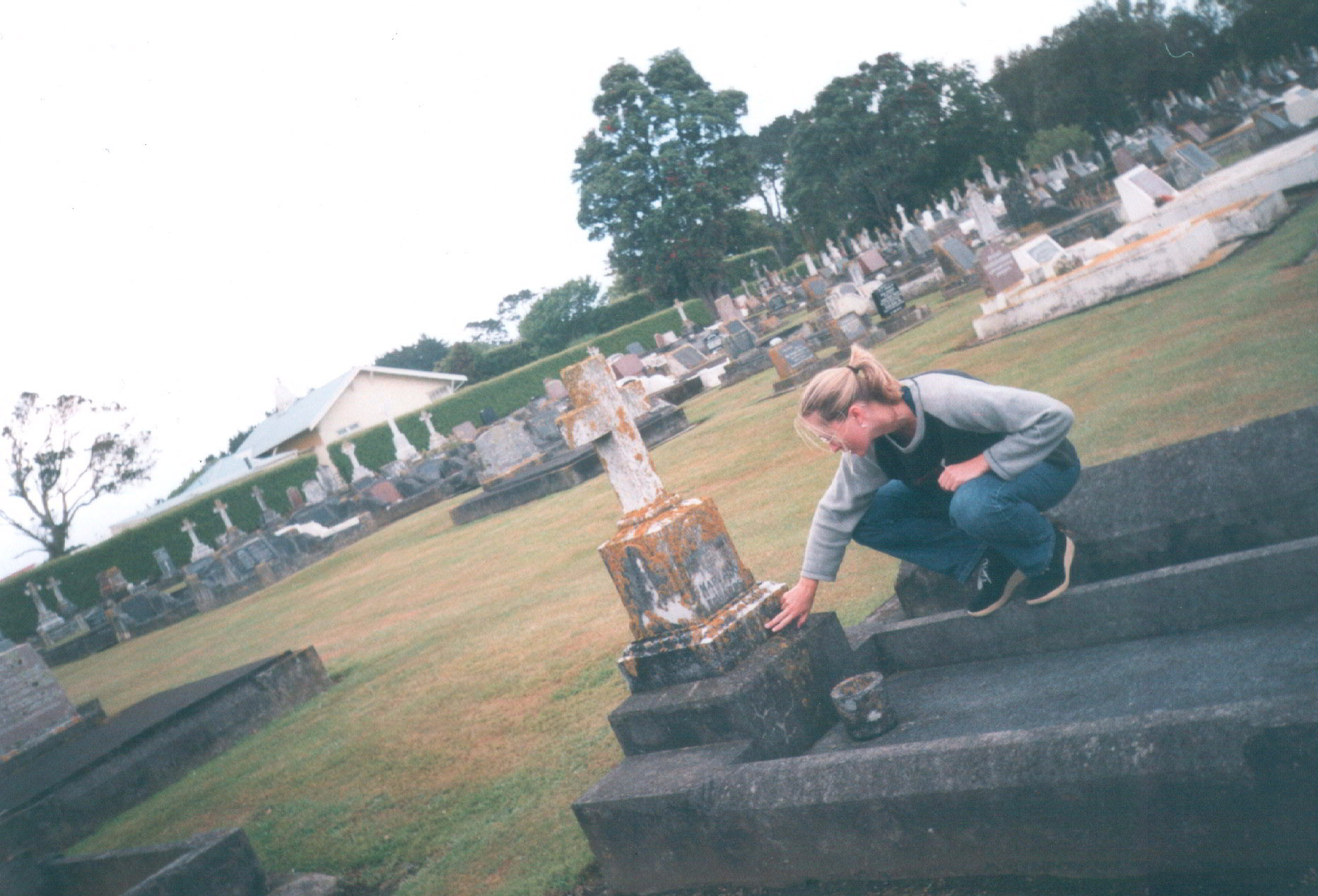 8Frances JACKSON, Letter and picture from Frances JACKSON, 14 Feb 2001, 2000, Frances Jackson, 105 A Glendale Rd., Glen Eden, Auckland 1007, New Zealand. Pictures from Frances Jackson. Her daughter, Kirsty Mason, is in the picture of Mary Ann Grey's tombstone. Kirsty Mason by tombstone of Mary Ann Grey.