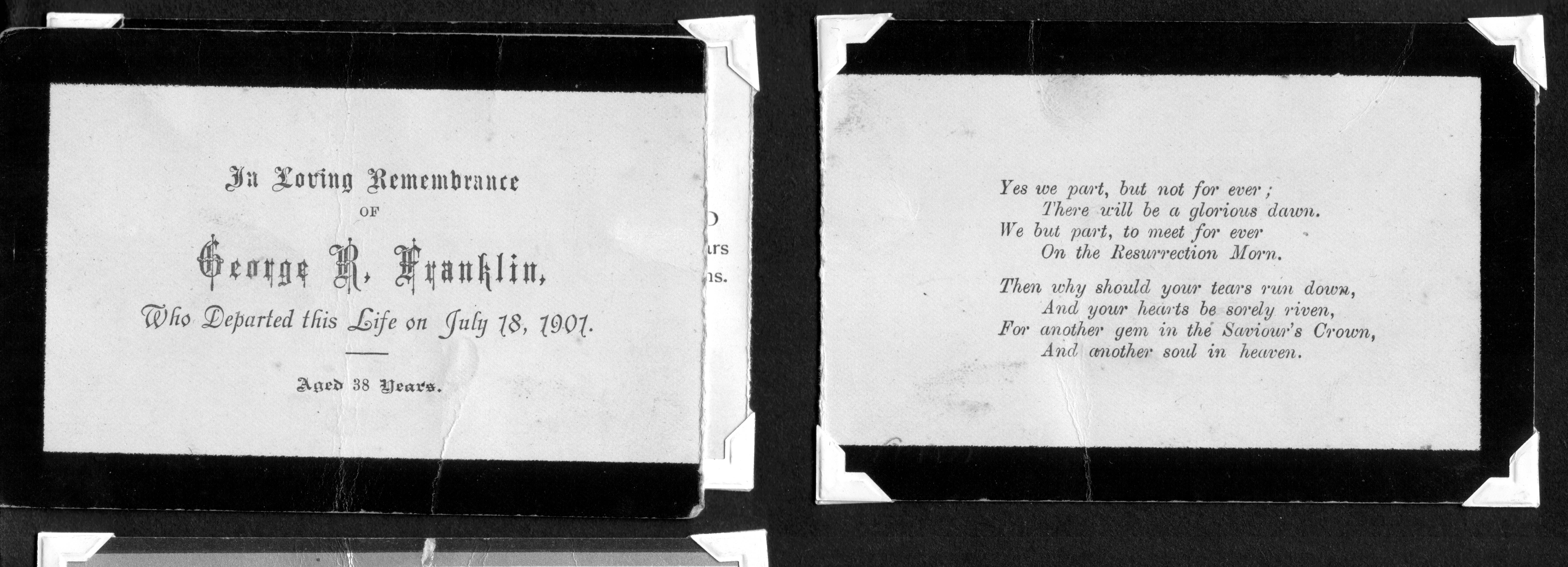 3Death notice of George Reuben Franklin, 1901, Shon R. Edwards, 1039 N 2575 W, Layton, UT 84041-7709, U.S.A. "In loving remembrance of George R. Franklin, who departed this life on July 18, 1901. Aged 38 years. Yes, we part, but not forever; there will be a glorious dawn. We but part to meet forever on the Resurrection Morn. Then why should your tears run down, and your hearts be sorely riven, for another gem in the Saviour's Crown, and another soul in heaven." Scanned copy in pos. of Shon R. Edwards. Image.
