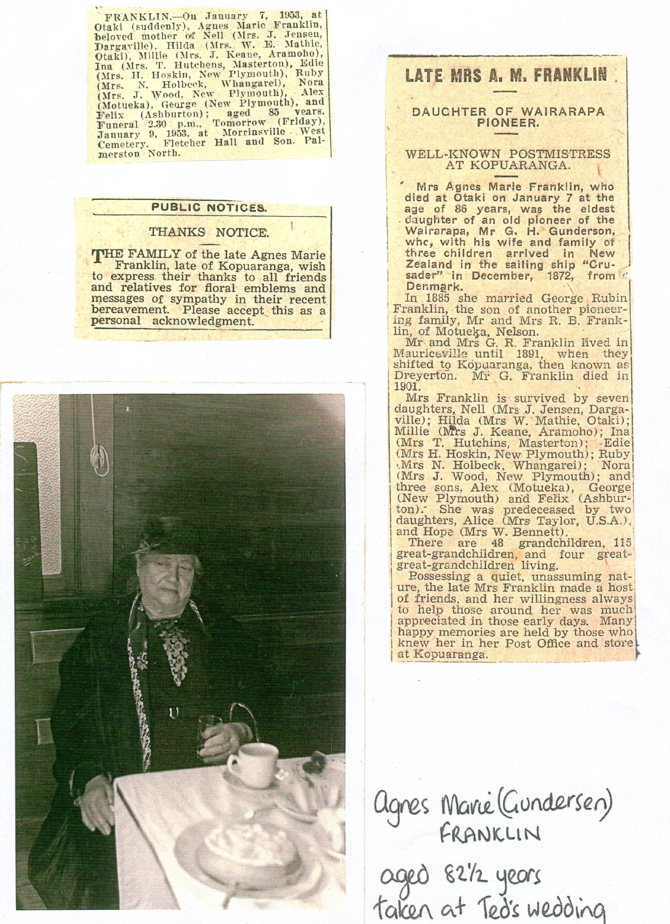 Agnes Marie ran the store and post office from her home (that little cottage I sent you a photo of, and raised 12 kids there !) after her husband, George Reuben Franklin, died of diabetes in 1901. She was also a midwife, often having her patients stay with her in her own home. She smoked and cured her own ham and bacon, and also for some of the Danish farmers and they gave her joints of meat for herself and family. She had a small orchard, bottled and pickled her own fruit and vegetables as well as making jam etc. She starched the stiff collars of the best shirts for some of the men who worked at the timber mill. She also found time to crotchet and sew for her large family. The kids had to do most of the housework while Agnes was busy. Hilda says there was one time in her early teens when she was taking the outgoing mail to the train and collecting the incoming mail. There were Maoris standing on the platform and she was very scared of Maoris because she had listened to stories of the recent Maori wars. No way was she going to meet the train. That was one day the mail was missed.