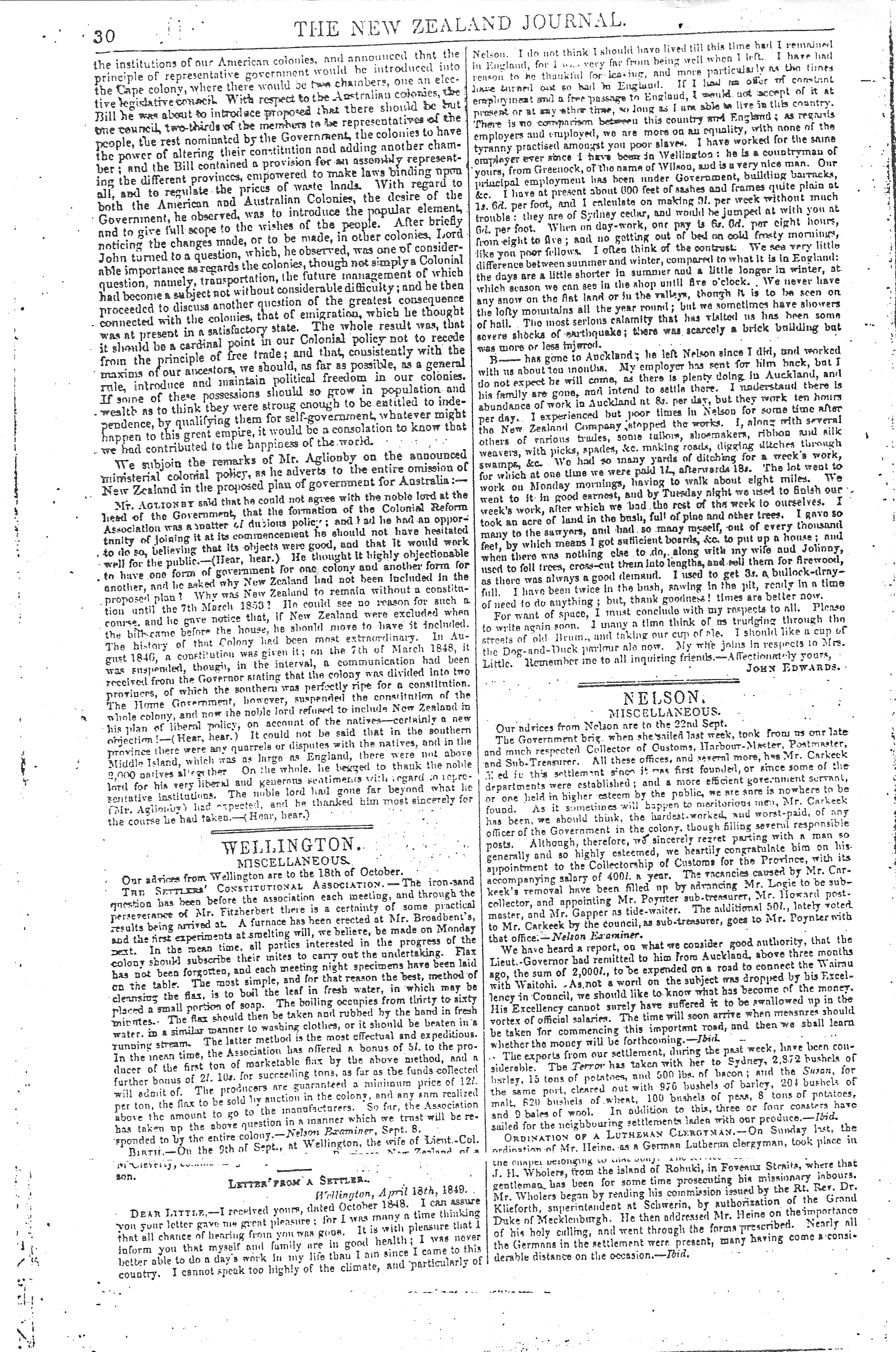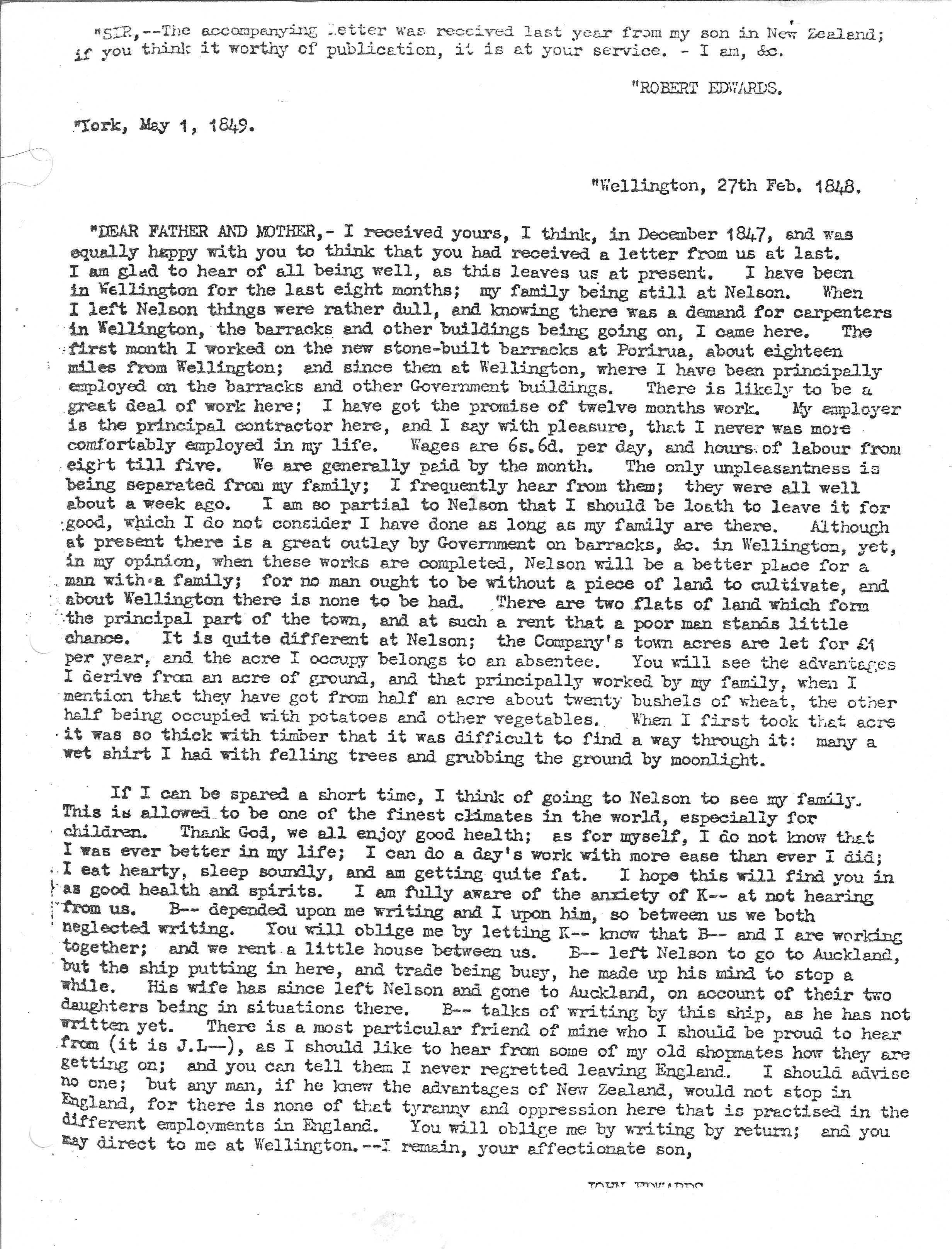 3Edwards, John Sr., Letter from John Edwards to his parents Robert and Mary 1848 (27 Feb 1848, Wellington and 1 May 1849, York), Shon R. Edwards, 1039 N 2575 W, Layton, UT 84041-7709, U.S.A. "“SIR - The accompanying letter was received last year from my son in New Zealand; if you think it worthy of publication, it is at your service. - I am, &c.