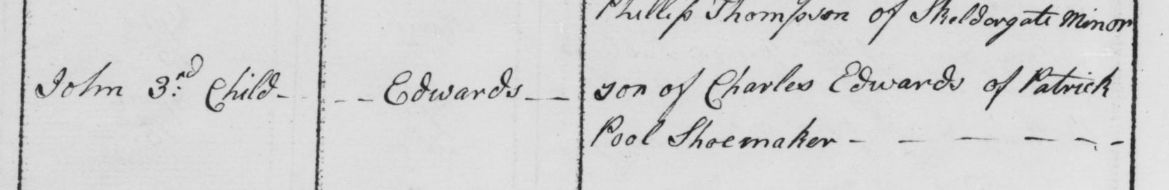 2Ancestry.com, Ancestry, 20 Feb 1842, Shon R. Edwards, 1039 N 2575 W, Layton, UT 84041-7709, U.S.A. "Baptisms solemnized in the parish of Upper Chelsea, in the county of Middlesex, 1842. No. 1522. 20 Feb 1842, born Dec. 29, 1841. Robert, son of John and Mary Edwards, living at 7 Franklins Row, trade, carpenter. Ceremony performed by W. Jay." Image.