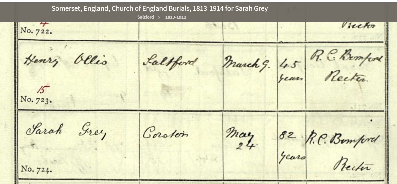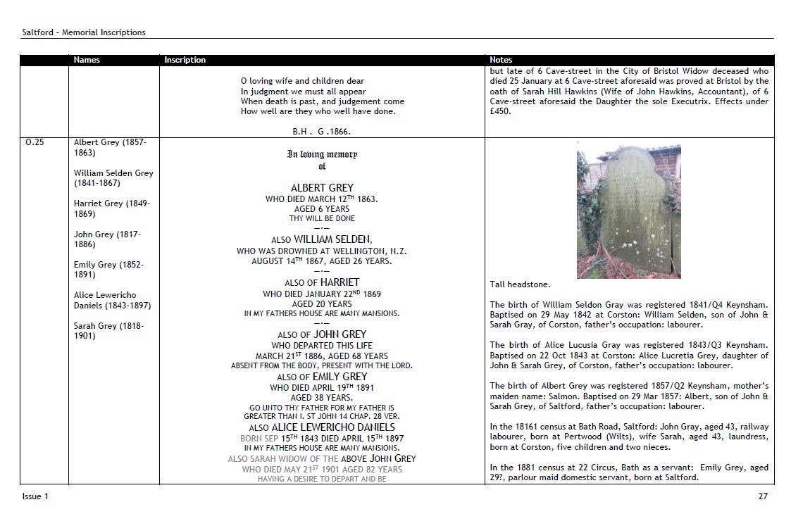 4Bendall, P.J., Saltford Memorial Inscriptions (2017), p. 27, Shon R. Edwards, 1039 N 2575 W, Layton, UT 84041-7709, U.S.A. https://www.batharchives.co.uk/sites/bath_record_office/files/SAL%20Memorials%20Issue%202.pdf. Image.