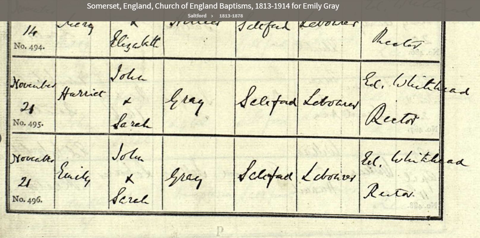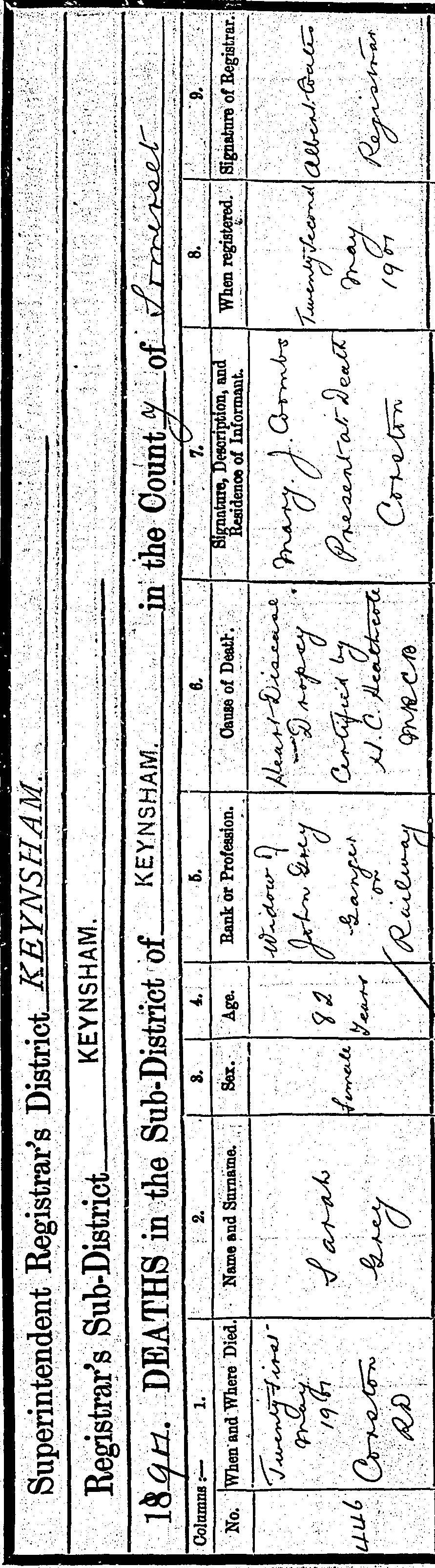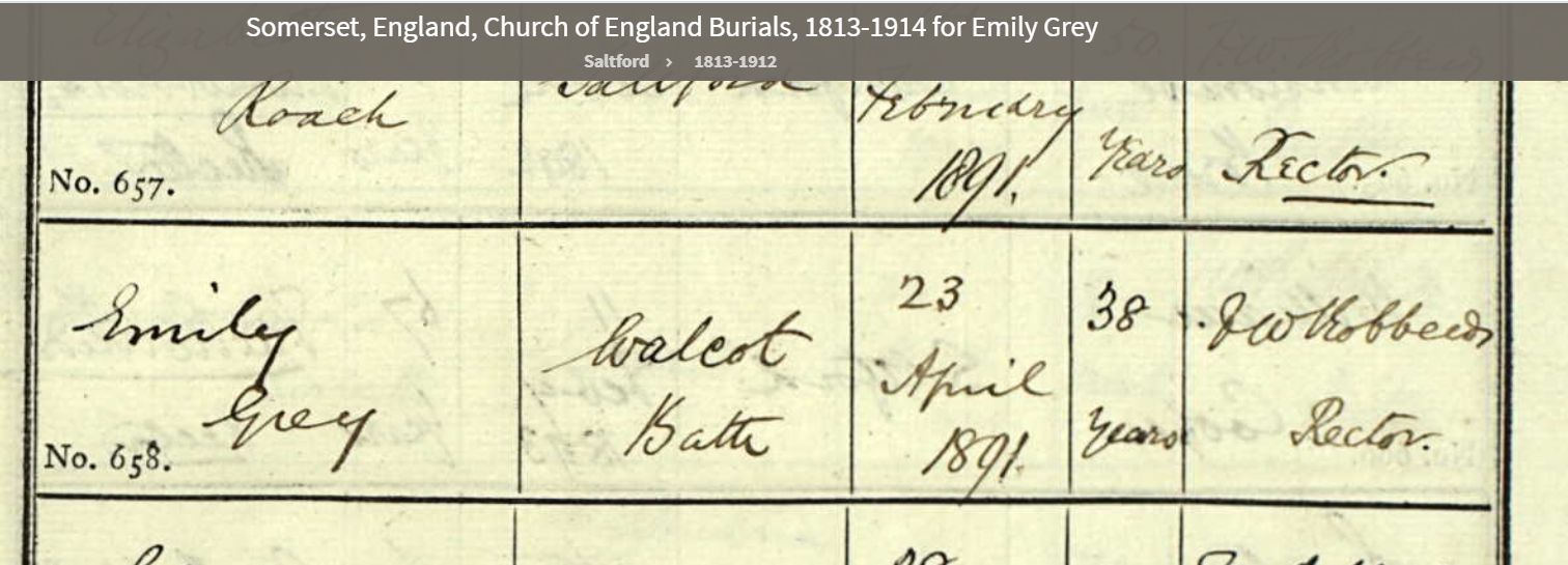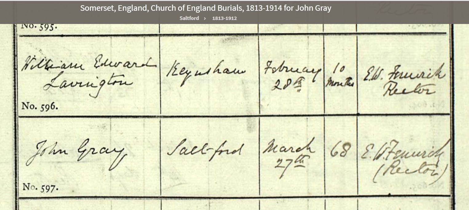13General Register Office, England - Civil Registration - Births (1837-present), Application number 6444931-1, 21 Mar 1886, General Register Office, PO Box 2, Southport Merseyside, PR8 2JD, United Kingdom. www.gov.uk, certificate.services@gro.gsi.gov.uk. "no. 65 died 21 Mar 1886 Saltford, John Gray, Male, 68 years, Railway Platelayer, cause of death bronchitis 6 days certified by RW ... MRES. Informant: Emily Gray, daughter present at the death, Saltford. Registered 24 Mar 1886, Charles Glover, registrar." Image.