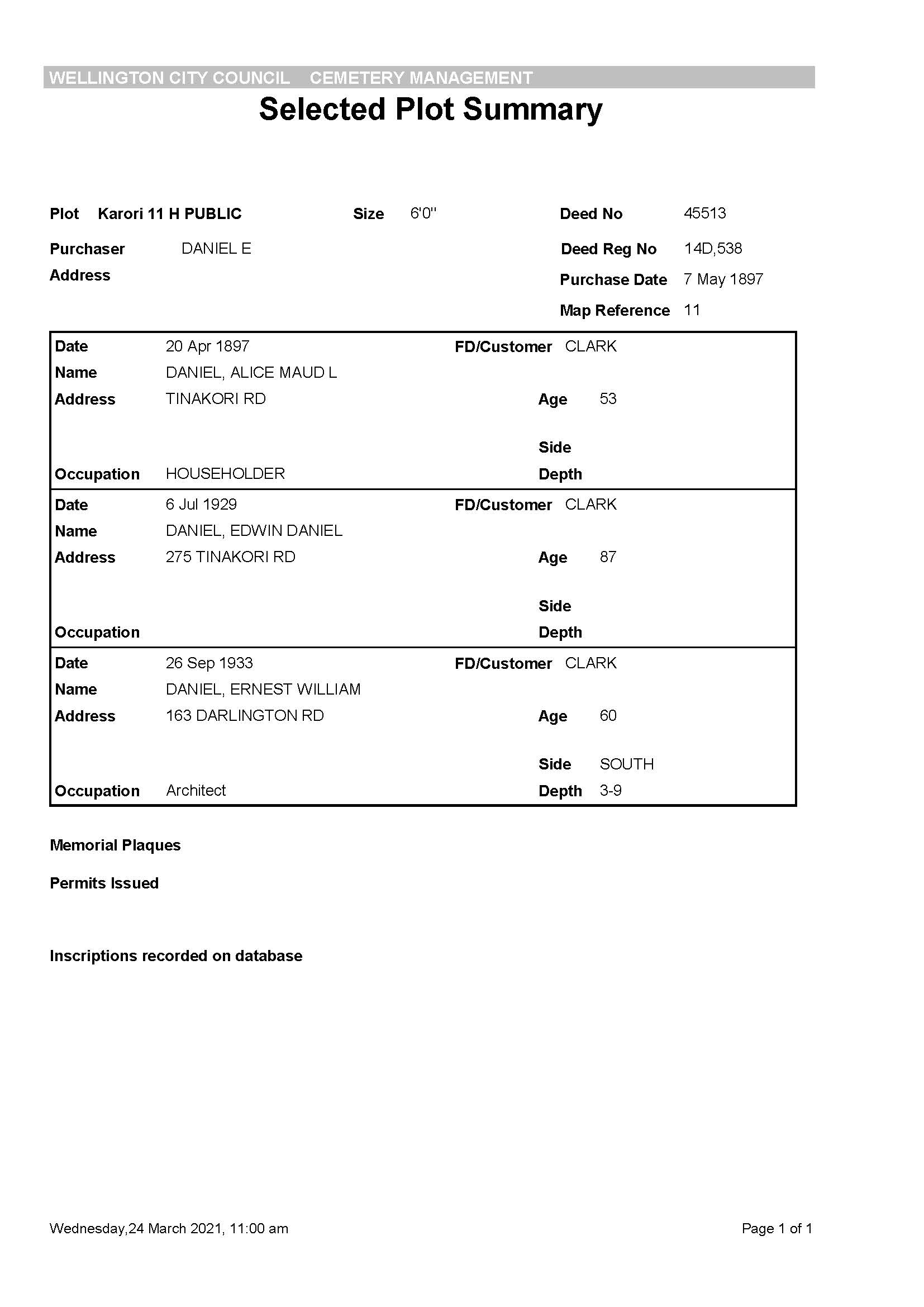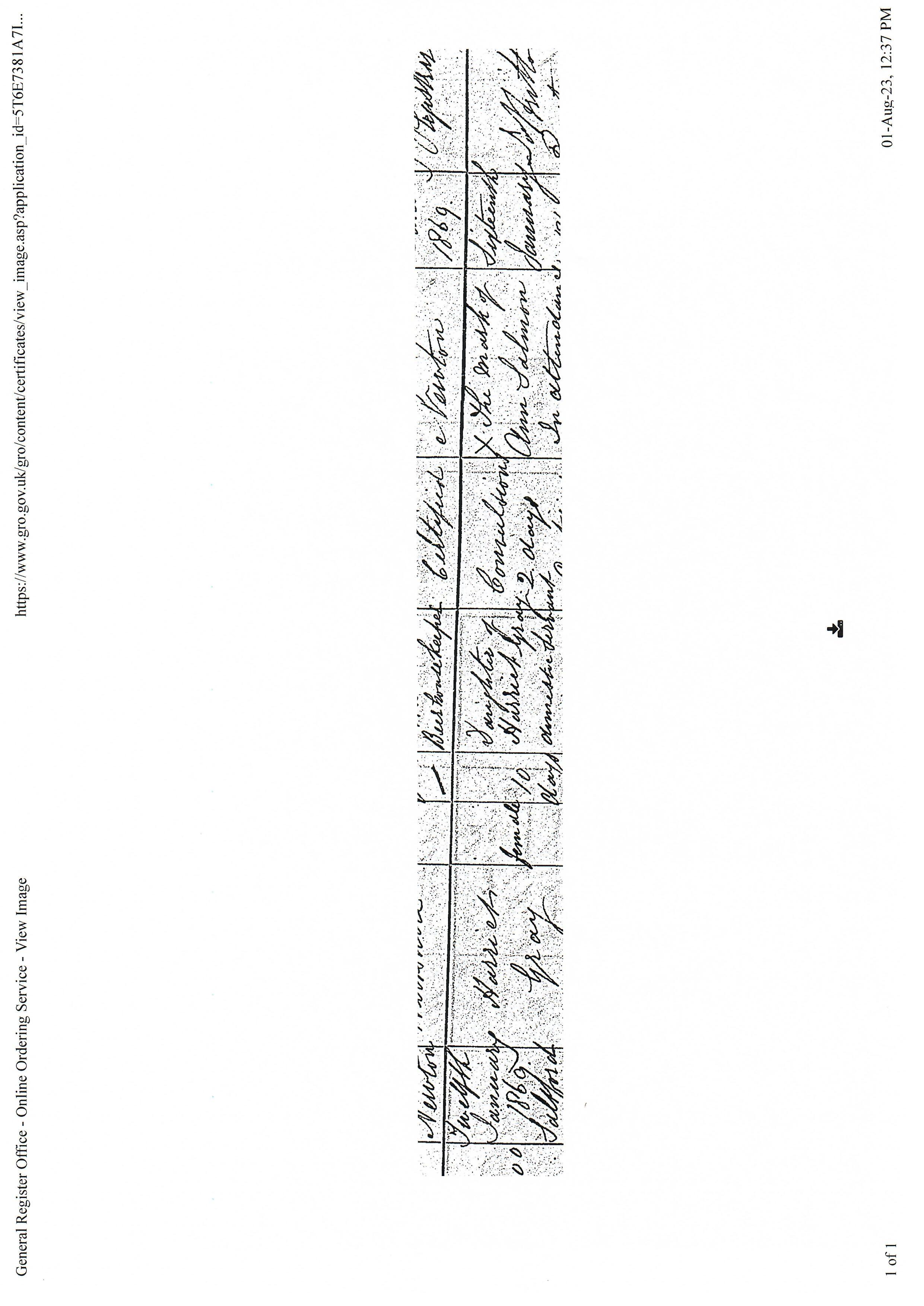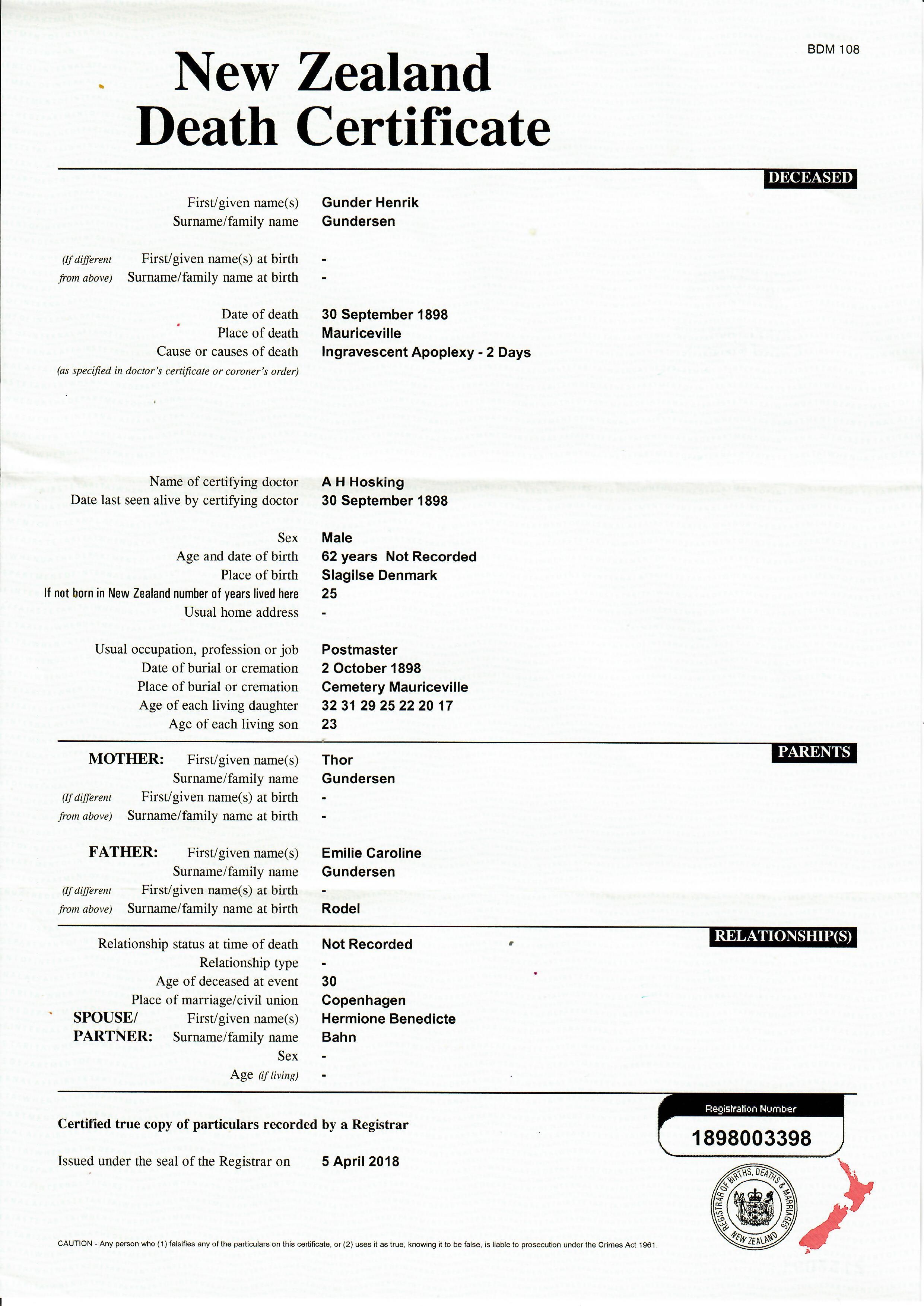 Certified to be a true copyo of the above particulars included in an entry of death in the records of the registrar general's office. Given under the seal of the Registrar-General at Wellington the 9 day of October 1975.". Image.16New Zealand-Obituaries, Evening Post, p. 2, 27 May 1889, 27 May 1889. https://www.ancestry.com/mediaui-viewer/tree/25998183/person/1763446821/media/6517147f-4363-4a22-85bd-f033ee5d8d1c?destTreeId=82146468&destPersonId=46459057884&_phsrc=gvR13&_phstart=default. Image.
