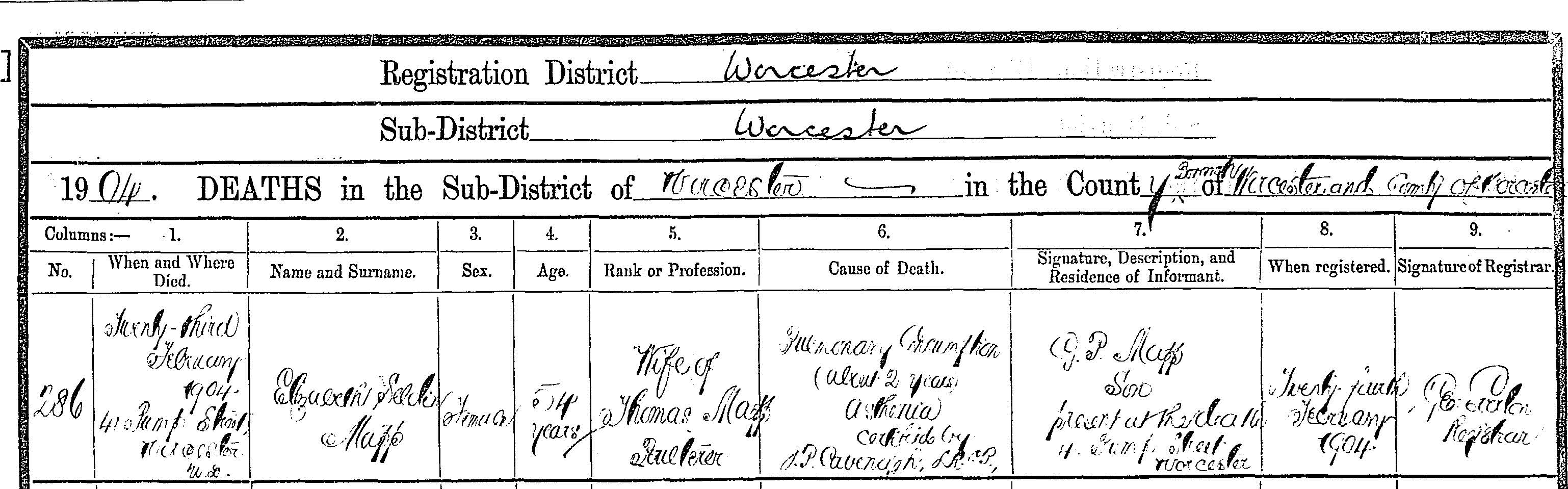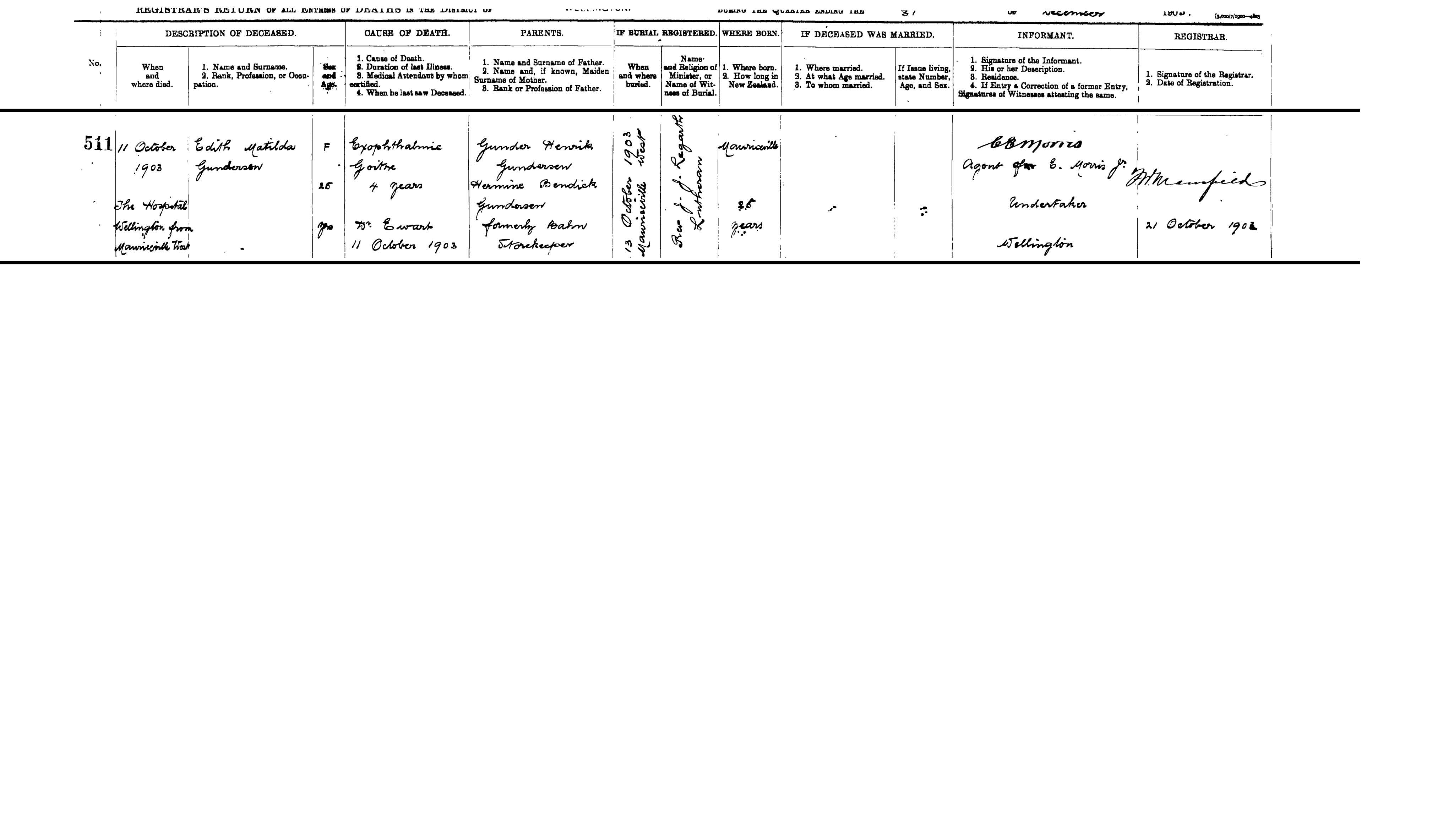 This is the last will and testament of me John Edwards… of Taita in Hull County in the provincial District of Wellington in the Colony of New Zealand, Carpenter. I revoke all wills by me at any time heretofore made. I … and bequeath all the … and personal estate to which I shall be entitiled at the time of my decease to my son, John Edwards the Younger. I appoint my my? Paid…executor of this my will to witness whereof I have hereto signed any …and this fourth day of February one thousand eight hundred and eighty six. Signed by the said John Edwards the testator …his last will and testament in the presence of us…present at the same time who allow … request in …sign and presence anad in the presence of…other have hereunto subscribed our names as witnesses. John Edwards, Robert Burns, Alphonsus Rush. This is the …writing or will now produced and …”A” …to the affidavit of John Edwards sworn be…me this 29th day of May 1889, Tho Oldthorpe?, a solicitor of the Supreme Colony of New Zealand.". Image.15Registrar General, New Zealand, Death certificate of John Edwards Sr. (1889), Shon R. Edwards, 1039 N 2575 W, Layton, UT 84041-7709, U.S.A. "New Zealand, certified copy of entry of death in the registrar-general's office. Place of registration: Wellington