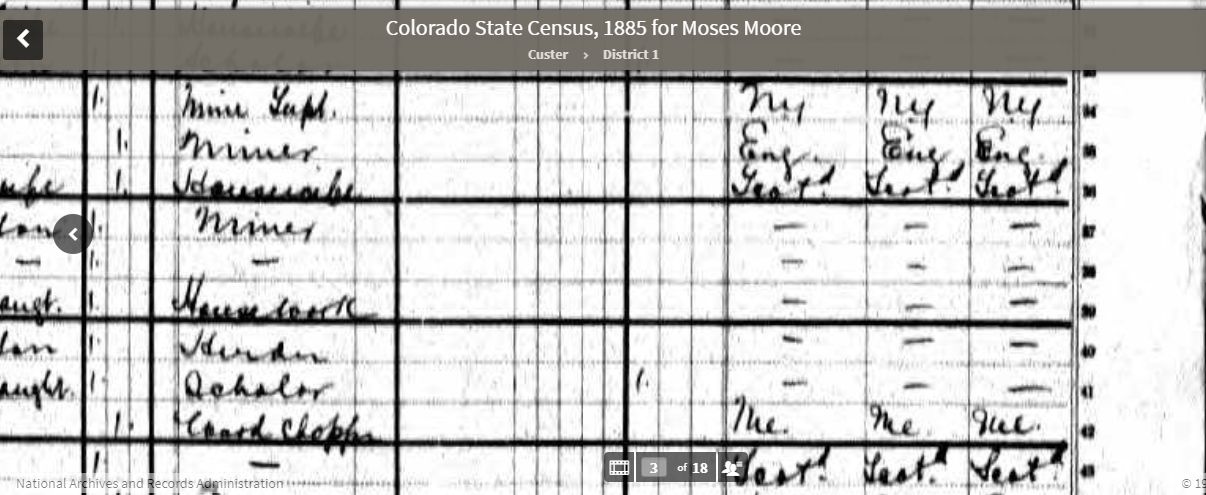 2United States of America. State of Colorado, Census - USA, Colorado - 1885 - Custer County, District 1 (online census), 1885, Ancestry.com, www.ancestry.com. https://www.ancestry.com/interactive/6837/cot158_3-0143.1?pid=61478&treeid=&personid=&rc=&usePUB=true&_phsrc=Uvu70&_phstart=successSource. Image.