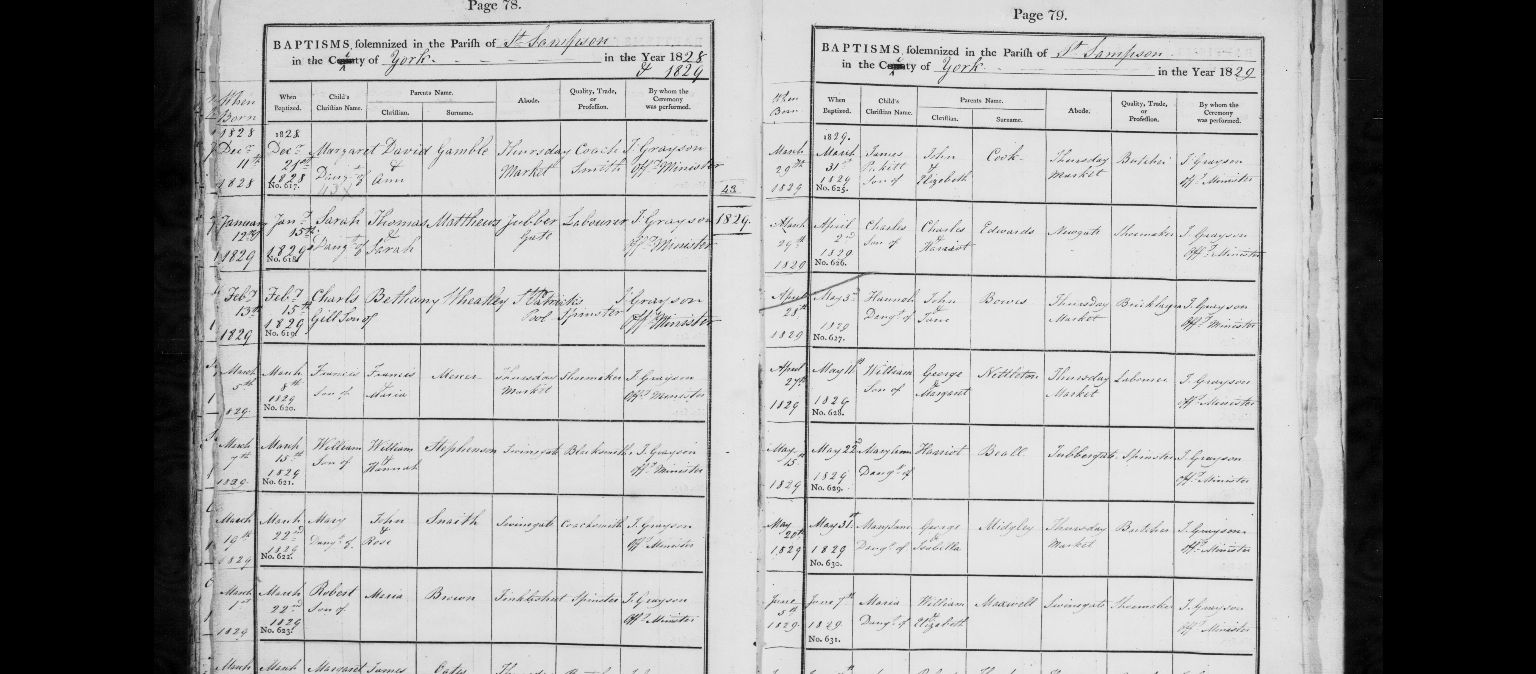 1Church of England, Church Records - England, Yorkshire, York - Parish Records, 1829, Internet. https://search.findmypast.co.uk/record?id=GBPRS%2FYORKSHIRE%2F007569107%2F00207&parentid=GBPRS%2FYORKSHIRE%2FBAP%2F302549675. Image.