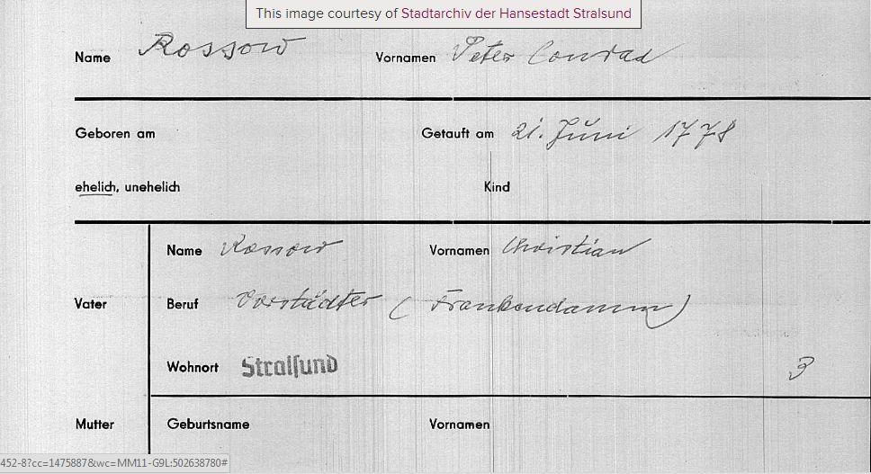 3Evangelische Kirche (Lutheran Church), Church Records - Germany, Preußen, Pommern, Stralsund - Parish Records, International Digital 4418279, 21 Jun 1778. "Name:  Rossow, Vornamen:  Peter Conrad, Getauft am 21 Juni 1778, ehelich, Vater:  Rossow, Vornamen:  Christian, Beruf:  Vorstädter (Frankandamm), Wohnort:  Stralsund, 3.  = Name:  Rossow, given names:  Peter Conrad, baptized on 21 June 1778, legitimate, Father:  Rossow, given names:  Christian, Occupation:  Suburbanites, Frankendamm.  Residency, Stralsund, 3." Birth card, not ID card. Image.