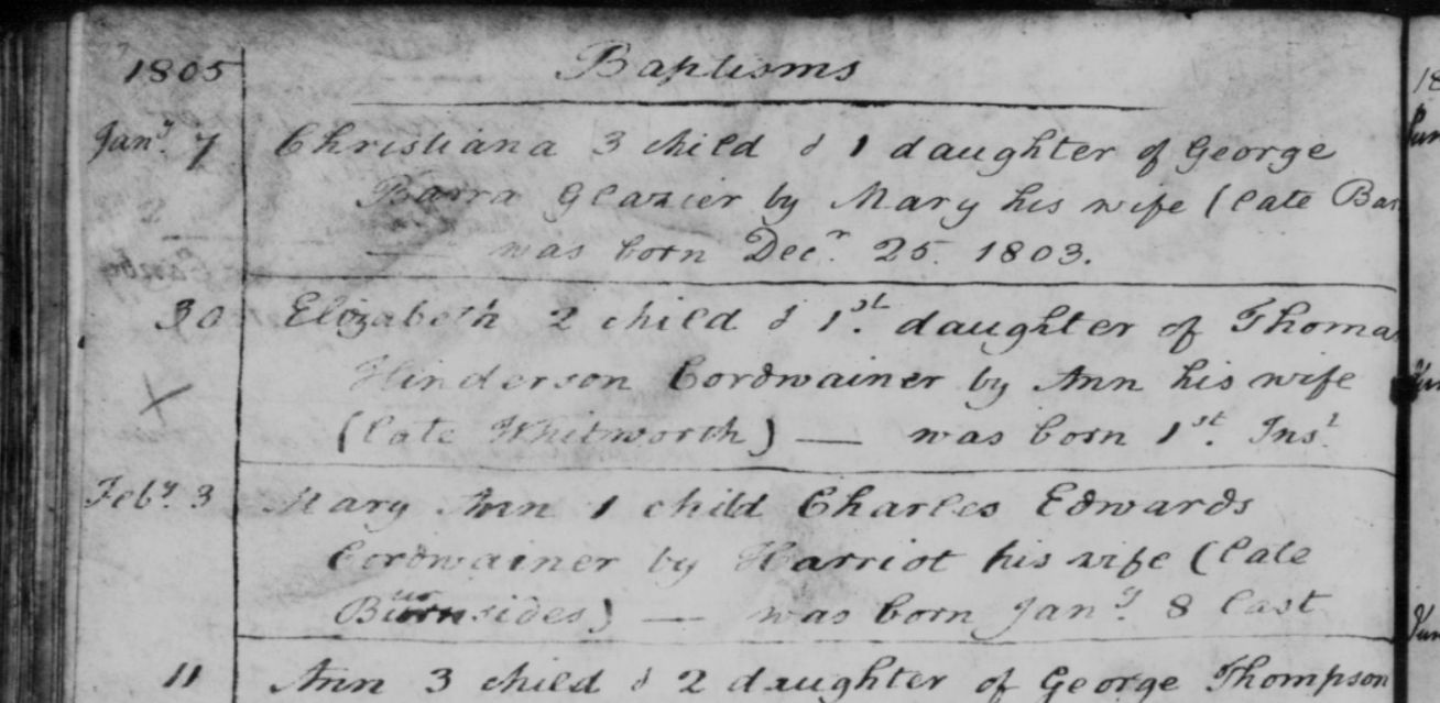 1Church of England, Church Records - England, Yorkshire, York - Parish Records, 1805, Internet. https://search.findmypast.co.uk/record?id=GBPRS%2FYORKSHIRE%2F007569088%2F00209&parentid=GBPRS%2FYORKSHIRE%2FBAP%2F302496652. Image.