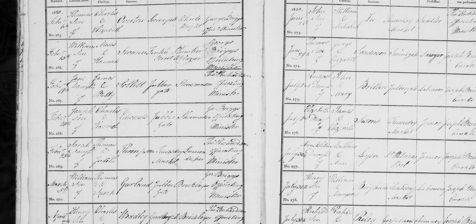 1Church of England, Church Records - England, Yorkshire, York - Parish Records, 1820, Internet. https://search.findmypast.co.uk/record?id=GBPRS%2FYORKSHIRE%2F007569107%2F00184&parentid=GBPRS%2FYORKSHIRE%2FBAP%2F302549312. Image.