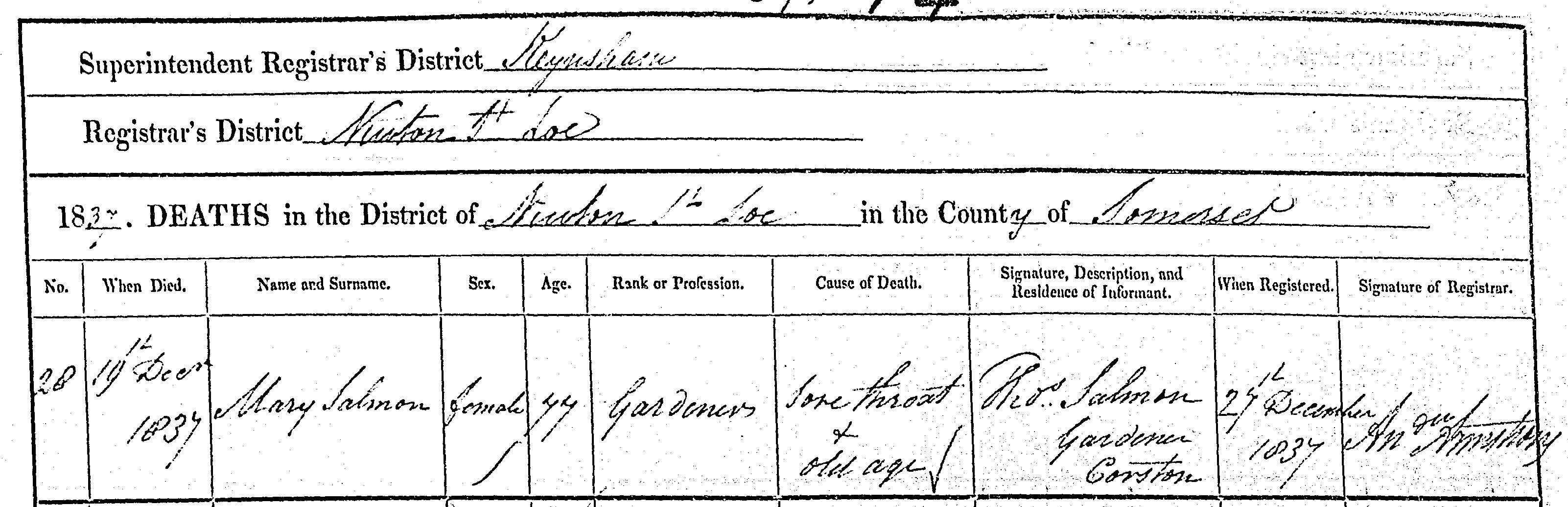 4Church of England, Cemeteries - England, Somerset, Corston, Shon Edwards' filing cabinet, top drawer, Somerset file., Jun 1988. Lists 20th as date, whereas certificate says 19th.