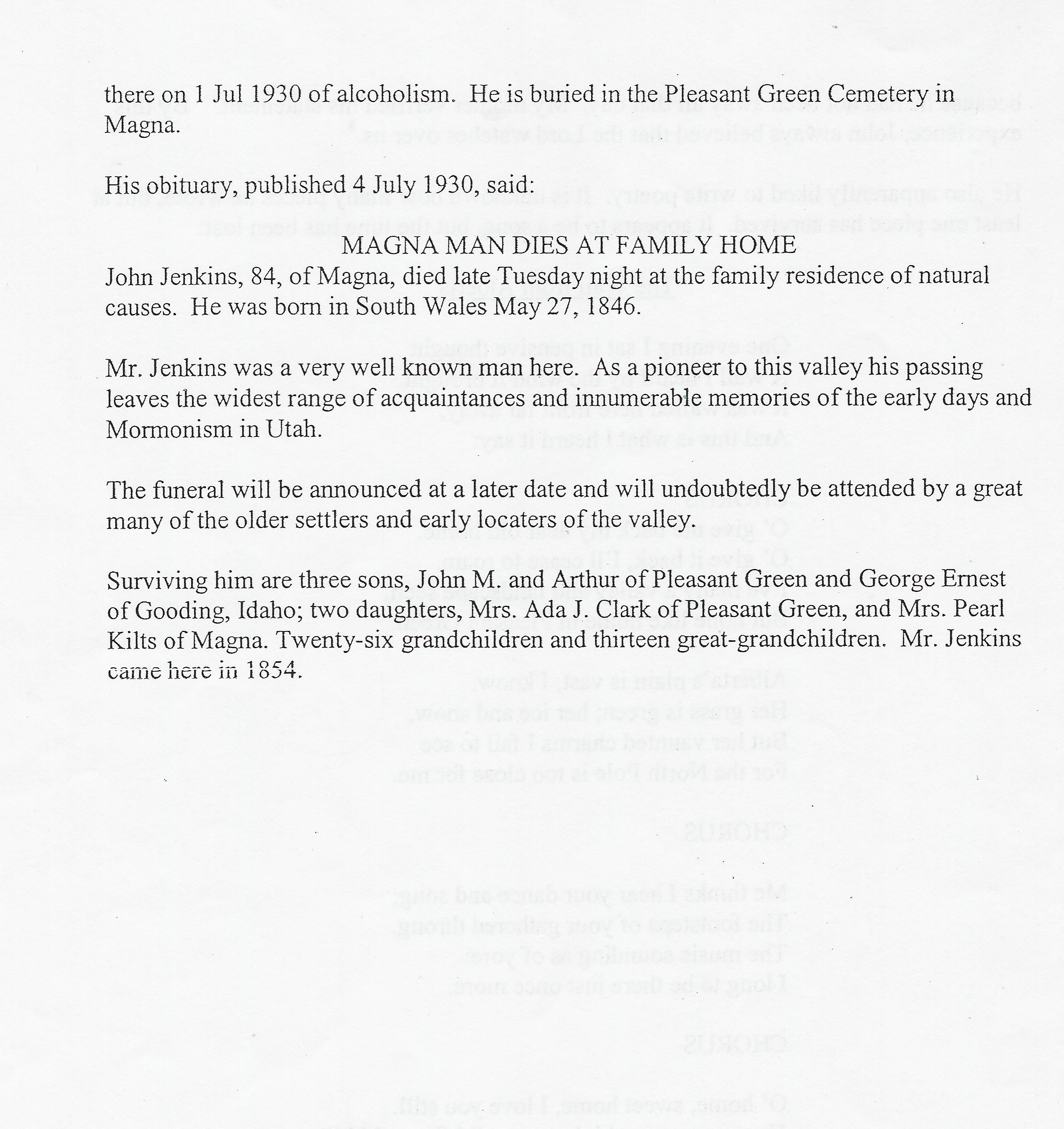 John JENKINS, b. 27 May 1846 in Llanelly, Carmarthen, Wales.